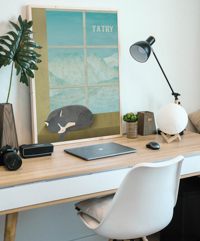 Plakat z polskimi górami - widok z okna na ośnieżone szczyty Tatr. Na pierwszym planie na parapecie drzemie kot, a w oddali góry z majestatycznym Giewontem zachęcają do wędrówki.