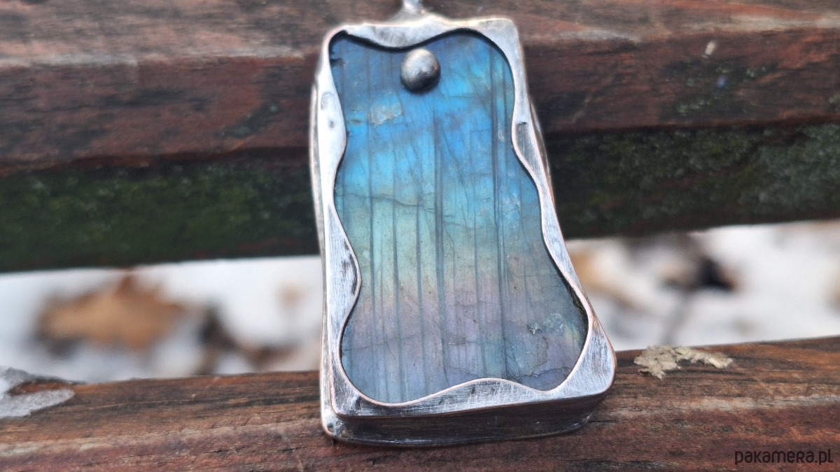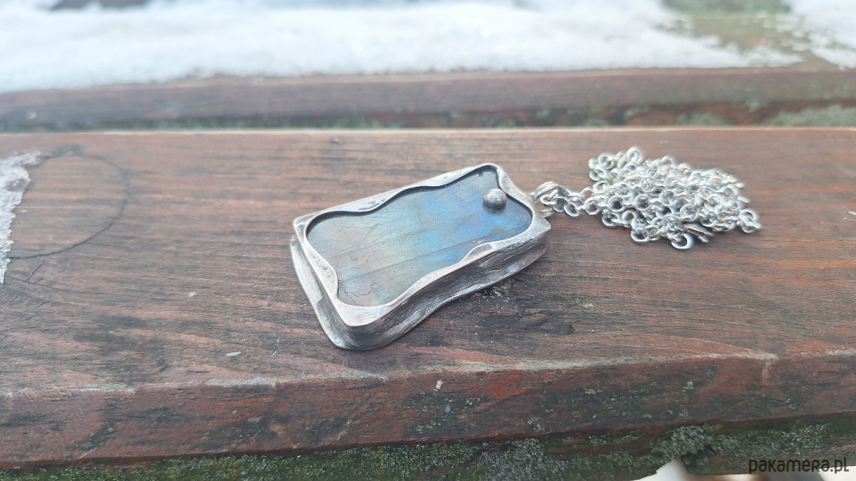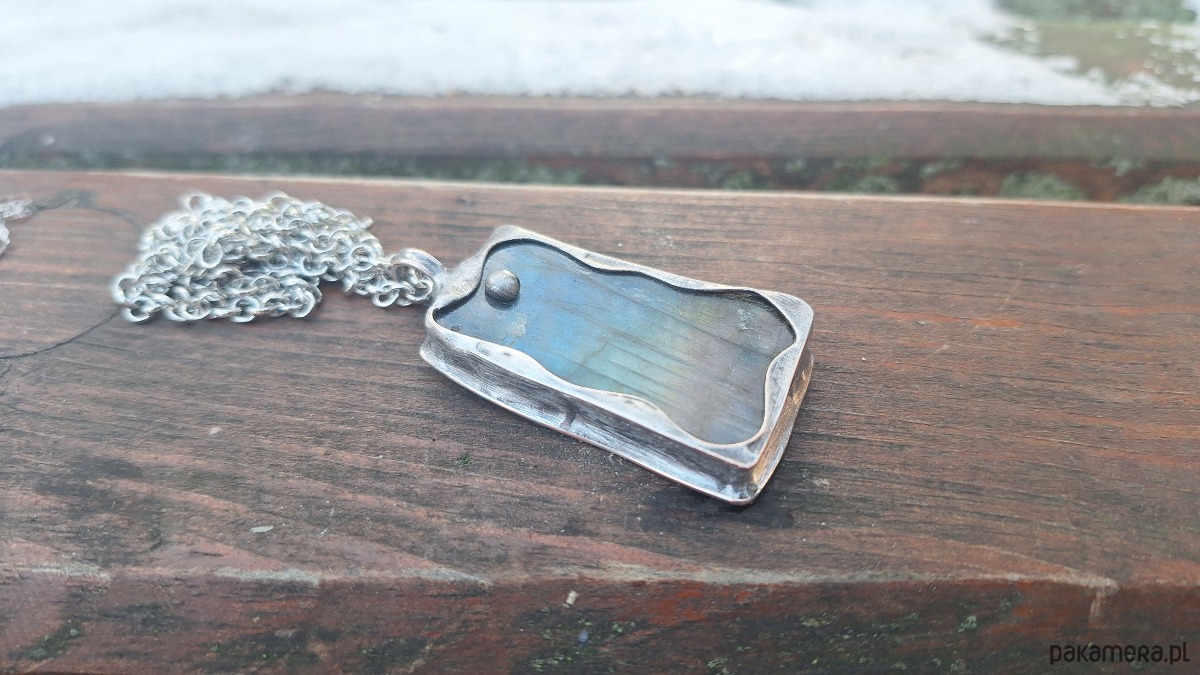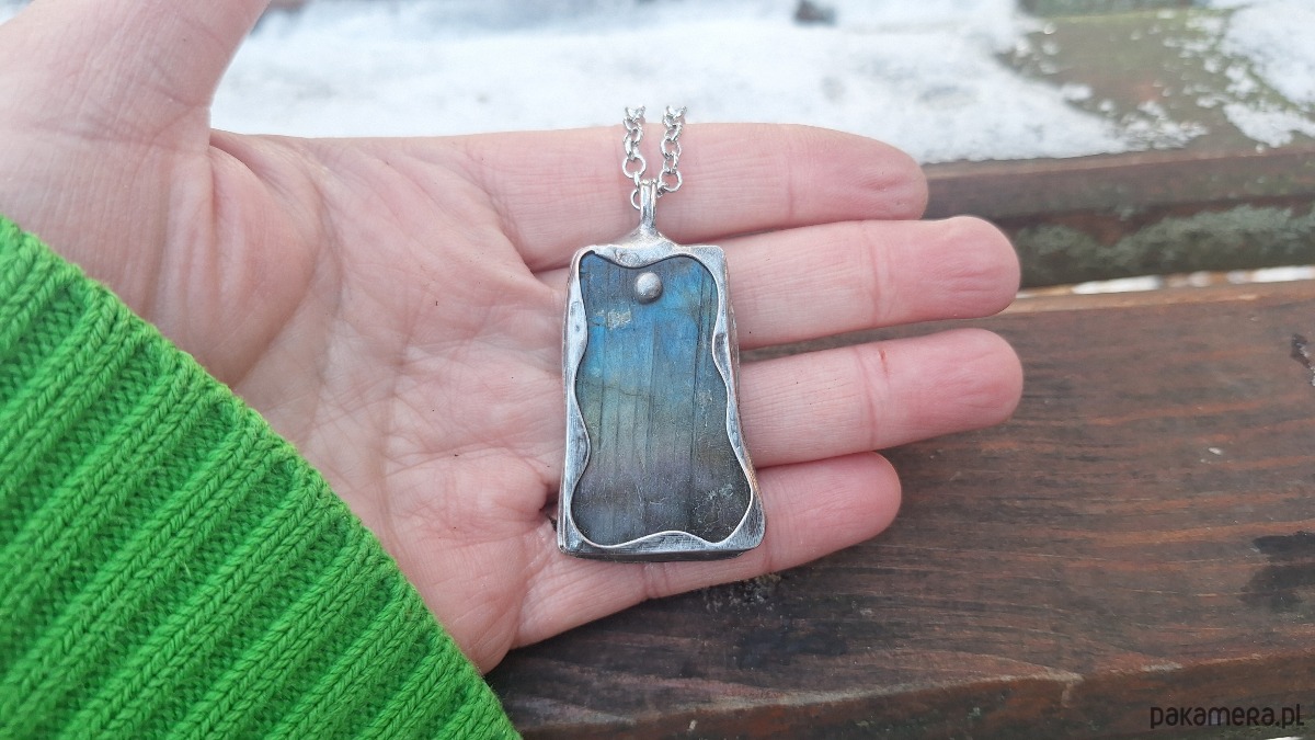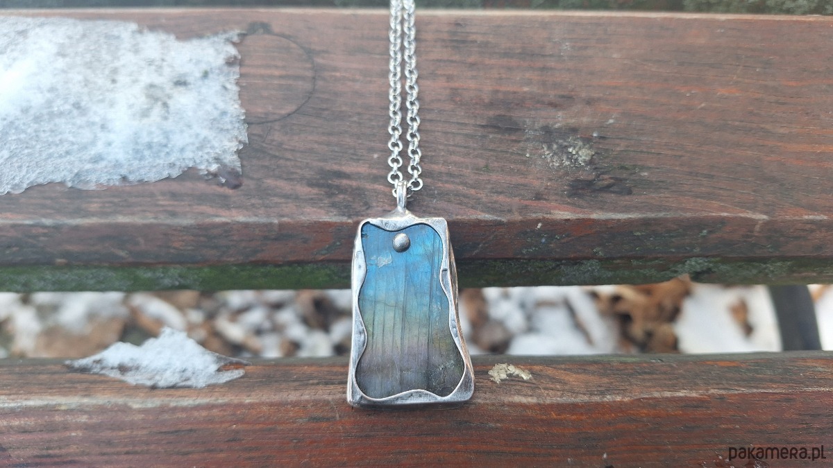 Wisiorek wykonany z miedzi, cyny i labradorytu. Wymiary ok. 4.5 na 2.5 cm. Zawieszony na łańcuszku o długości ok. 50 cm.