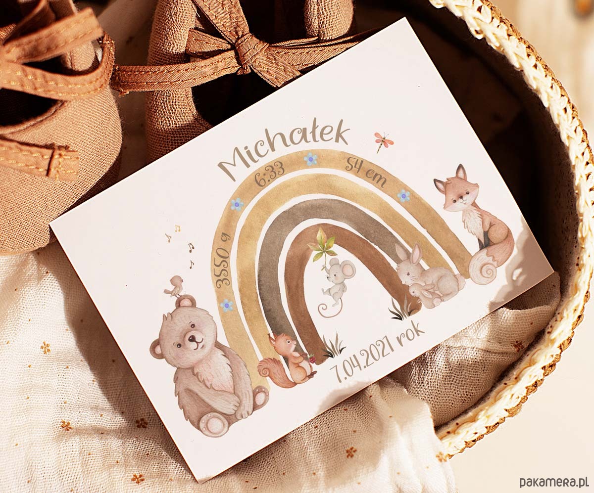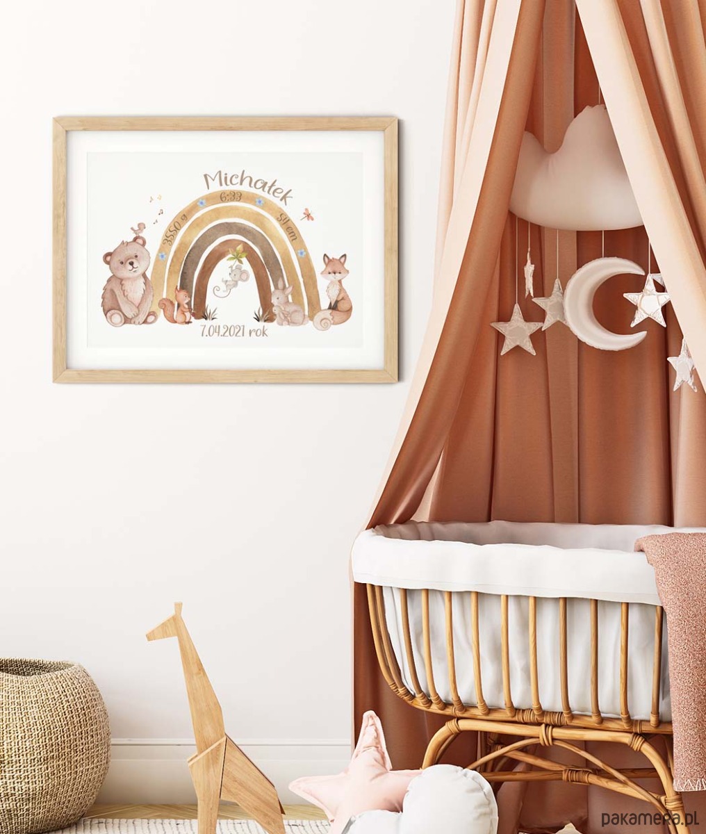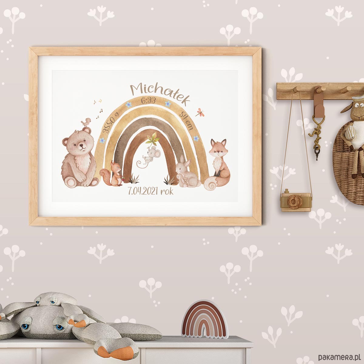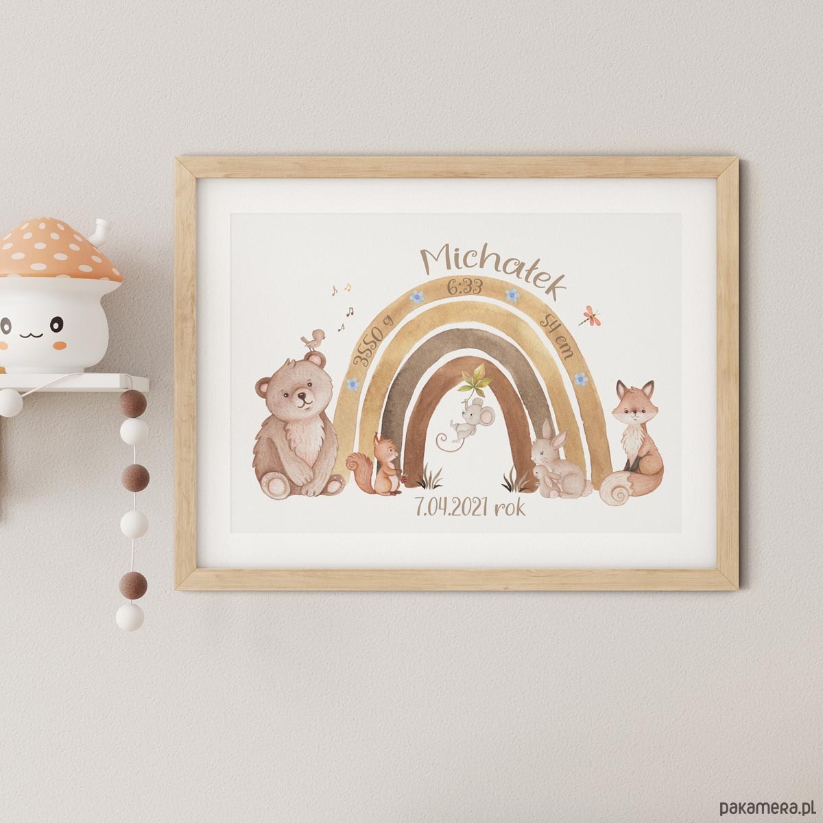 Tęcza Zwierzęta leśne Metryczka dla niemowlaka Obrazek dla dziecka Ramka