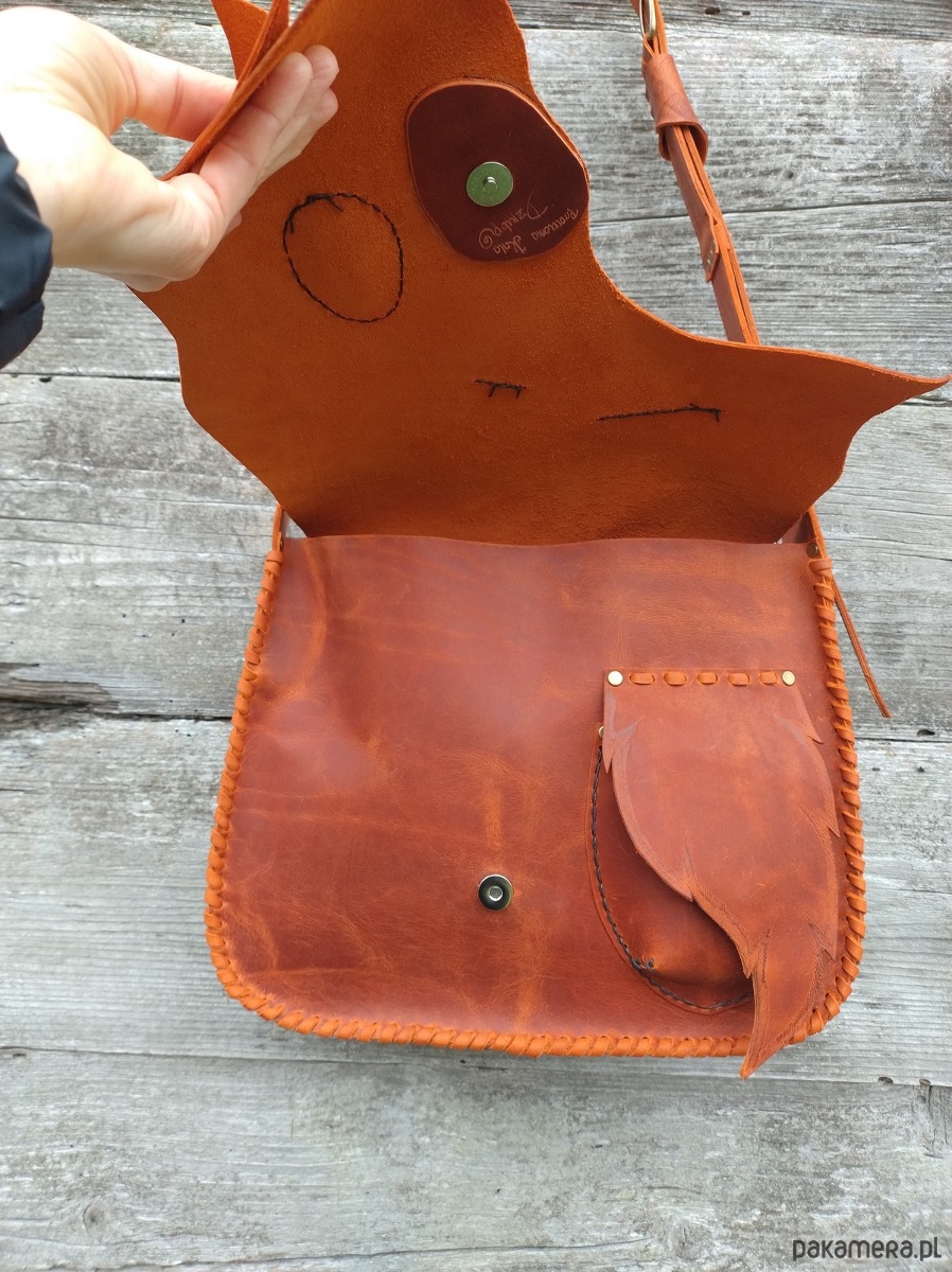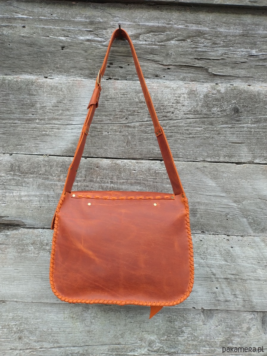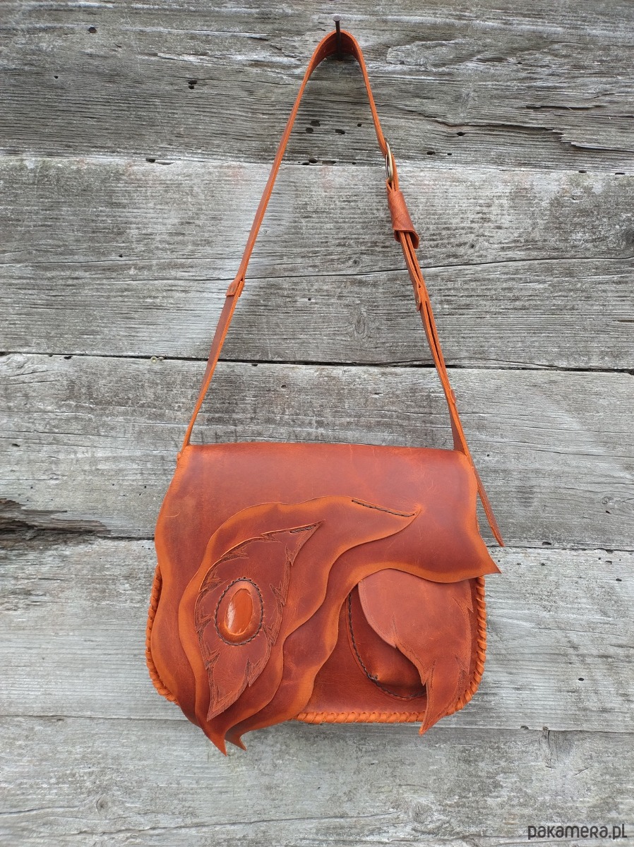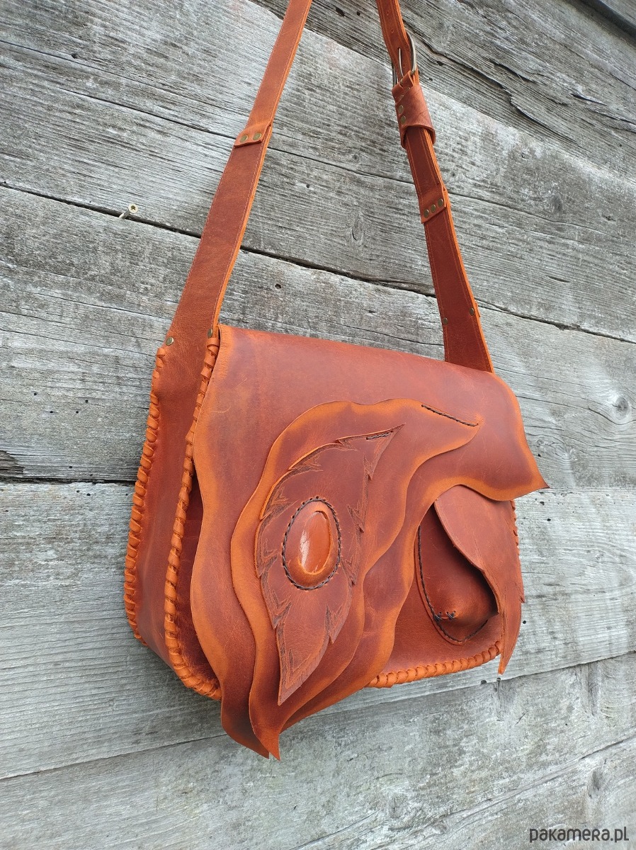 Torebka, duża teczka, wykonana ręcznie z naturalnej impregnowanej skóry w kolorze rudym ,przecieranym . Zszywana rzemieniem . Ozdobiona pieknym minerałem Jaspisem oraz motywem wypalonych metodą pirografii liści liści ( klapa , kieszonka zewnętrzna ) . Torebka zamykana na magnes .W środku kieszeń główna i kieszeń mniejsza zamykana na suwak . Torebka wykonana według autorskiego projektu .Pojedynczy egzemplarz . Teczka posłuży długie lata a z wiekiem będzie jeszcze piękniejsza . Pakowna i wygodna .