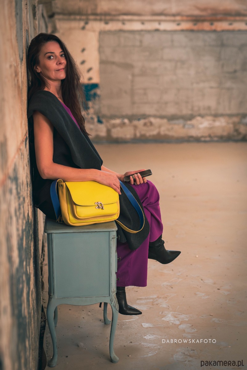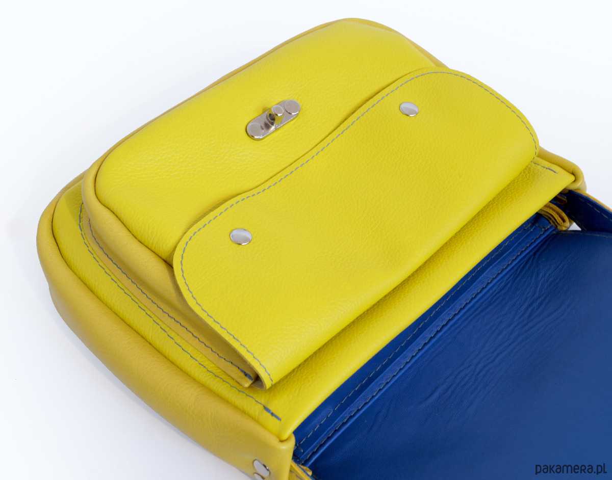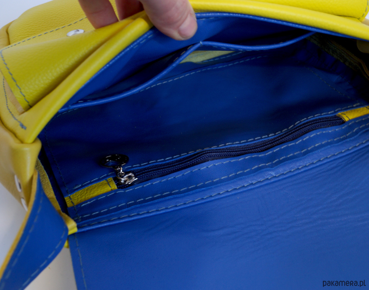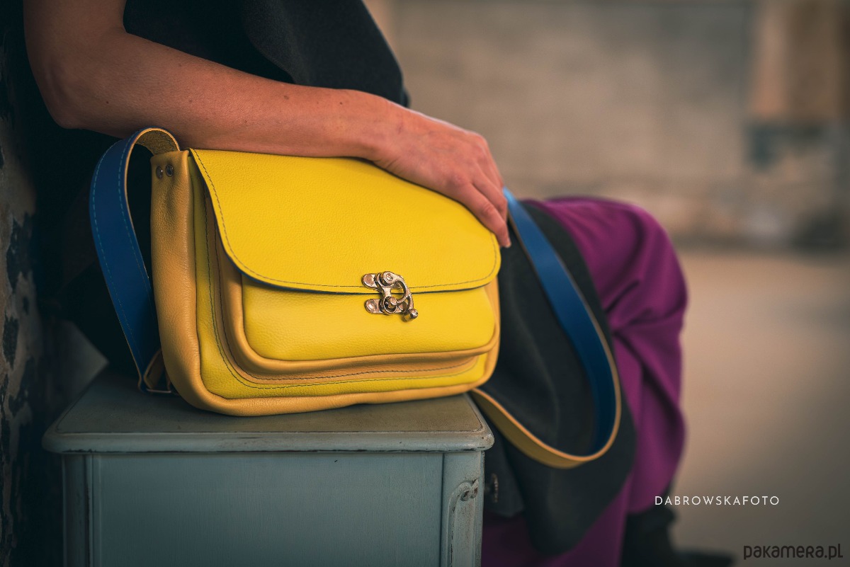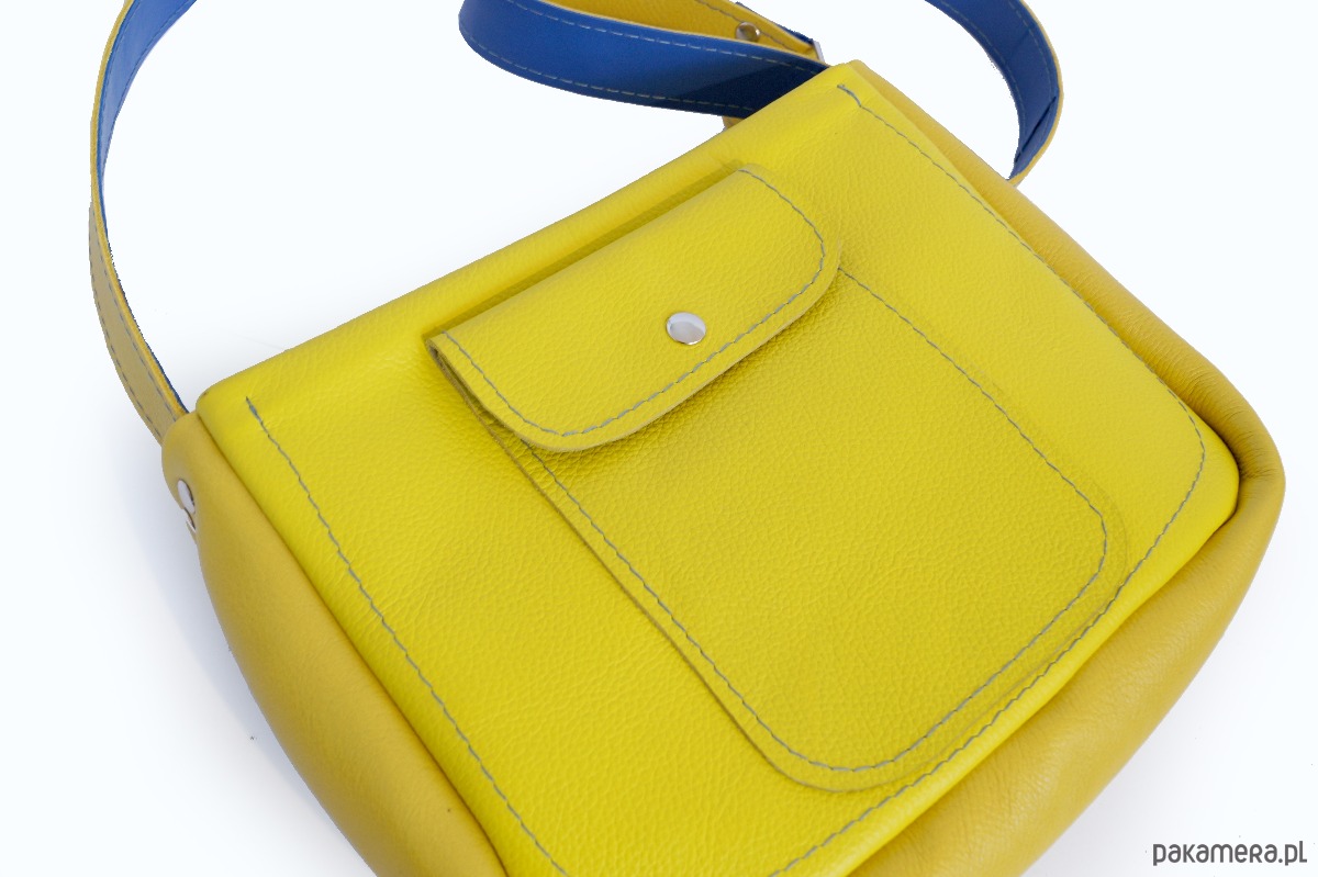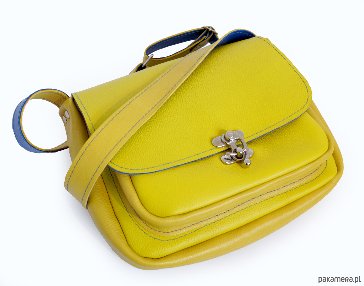 Niewielka, elegancka torebka o kroju klasycznej teczki. Uszyta ze świetnej jakości, mięsistej skóry naturalnej w kolorze żółtym (cytrynowym). Posiada dużą główną komorę, w której znajdują się kieszeń na zamek i dwie kieszenie otwarte. Z tyłu kieszeń na telefon. Wysokość - 20cm, szerokość - ok.28cm, głębokość głównej komory - ok 6cm, długość paska - max.130cm.