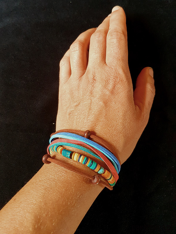 Kolorowa bransoletka wykonana z rzemieni ze skóry naturalnej, oraz koralików katsuki przecinanych okrągłymi koralikami z półszlachetnego turkusu i barwionego na turkusowo drewna.
