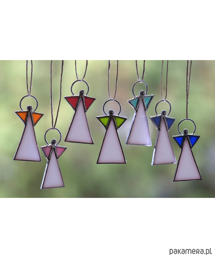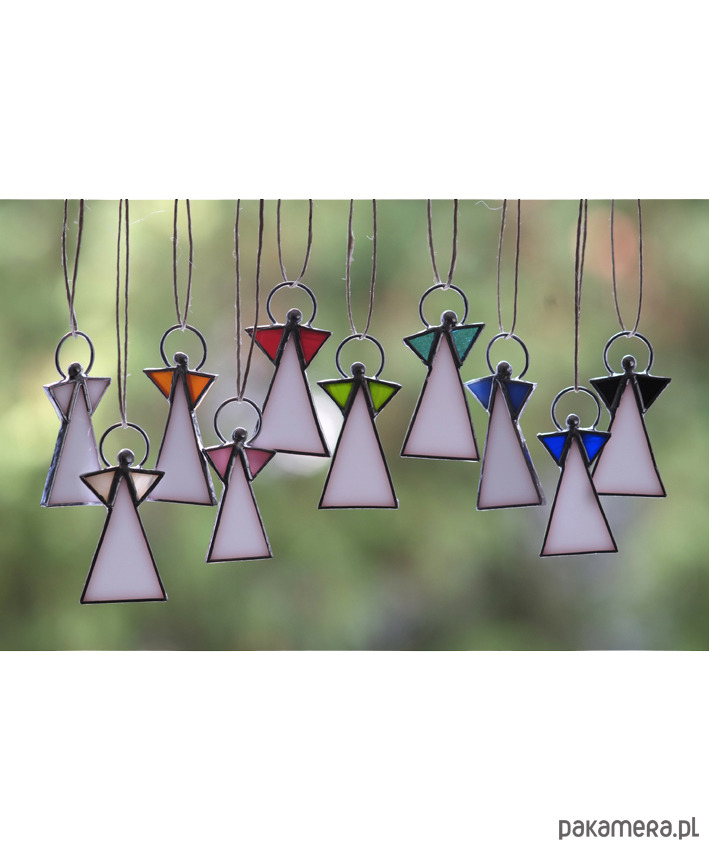 Aniołki zostały wykonane z ręcznie wycinanego szkła witrażowego, biała "sukienka", kolorowe skrzydełka, wykończone cyną w srebrnym kolorze. Aniołki są w całości ręcznie robione techniką Tiffany'ego z najwyższą starannością i dbałością o szczegóły.