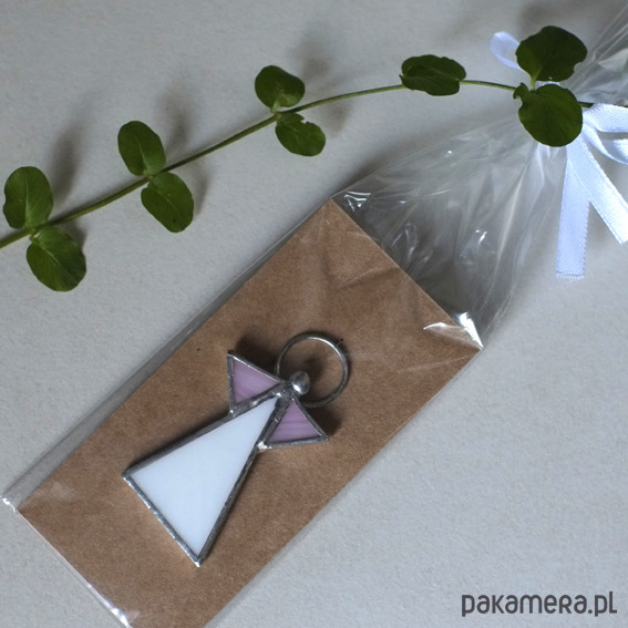 Każdy aniołek witrażowy jest zapakowany oddzielnie w celofanowy woreczek, umieszczony na kartoniku z ekologicznej, brązowej tektury, zawiązany białą wstążeczką