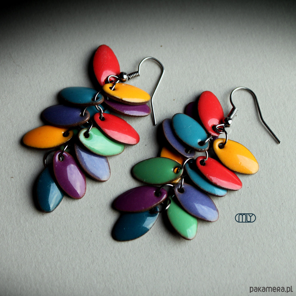 Oryginalne i efektowne ceramiczne kolczyki w formie gronek, ręcznie wykonane z gliny kamionkowej, jednostronnie szkliwione mieszanką błyszczących kolorowych szkliw z efektem plamek, na biglach ze stali chirurgicznej w kolorze srebra. Długość około 5cm. Polecam
