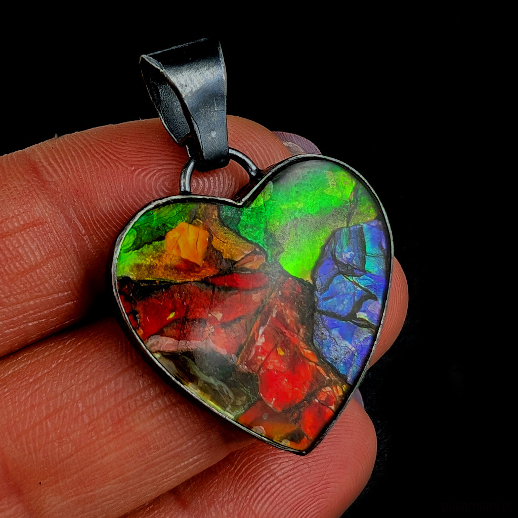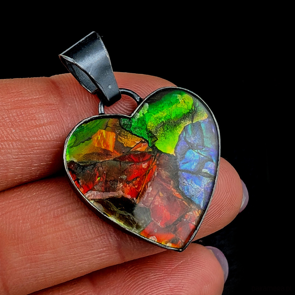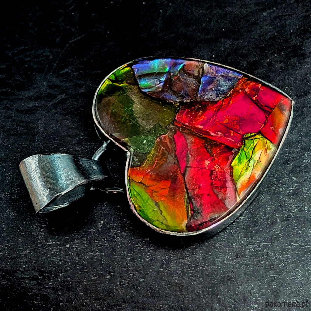 Przepiękny wisiorek z oprawionym w oksydowane srebro próby 925 ammolitem- kompozyt ammolitu oraz amonitu z kwarcem. Niesamowite barwy opalizujące w intensywnych odcieniach podkreślają oryginalny kształt kamienia. Wymiary oprawy 25 x 25 mm. Długość 37 mm. Waga wisiorka 5,3 g. Wisiorek zapakowany w ozdobne pudełeczko.