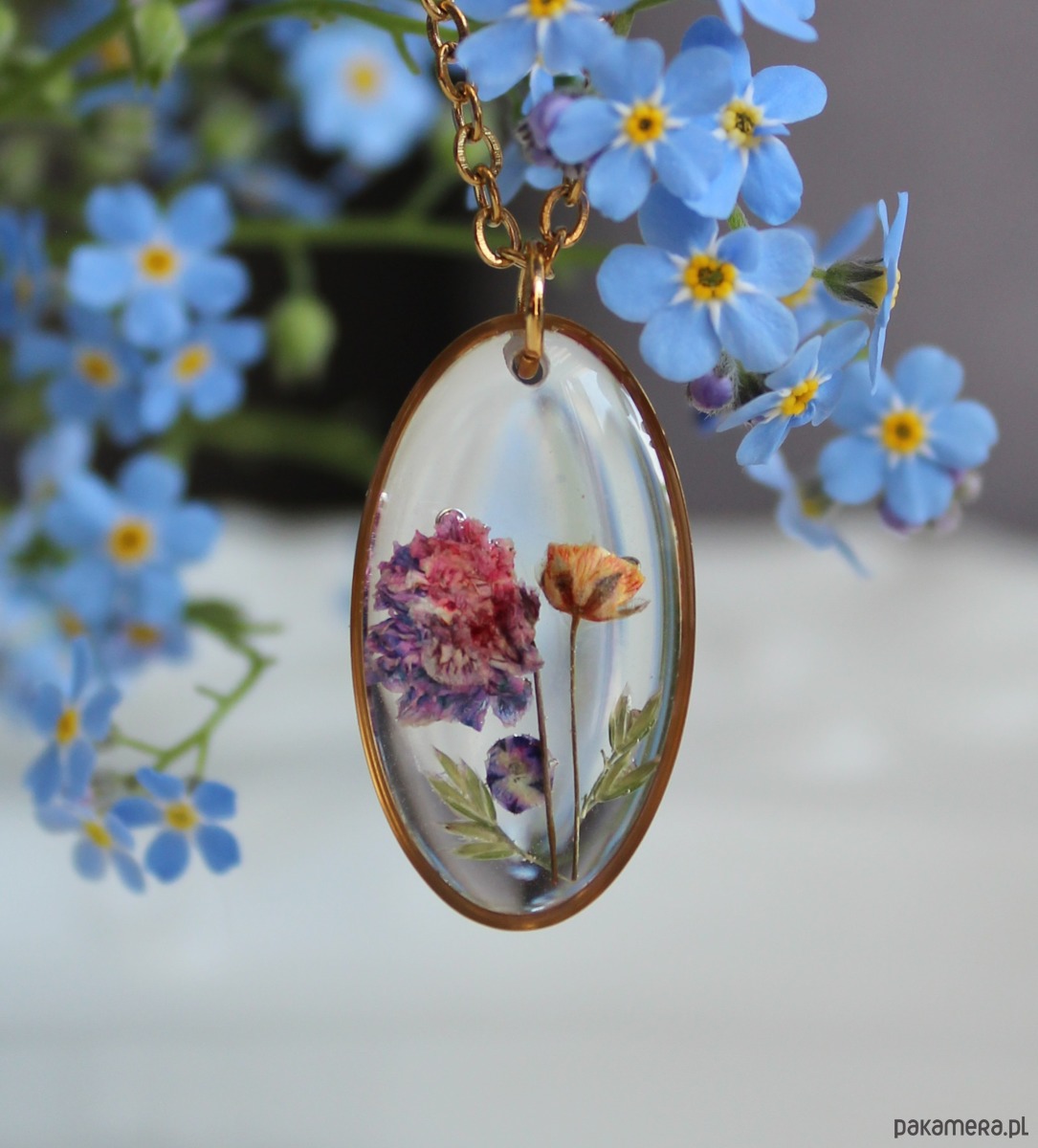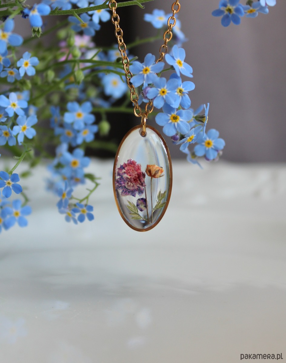 Oferuję Państwu unikalną biżuterię. Zawieszka jest wykonana z suszonych kwiatów i żywicy epoksydowej. Biżuteria jest wspaniałym i oryginalnym prezentem na lata.