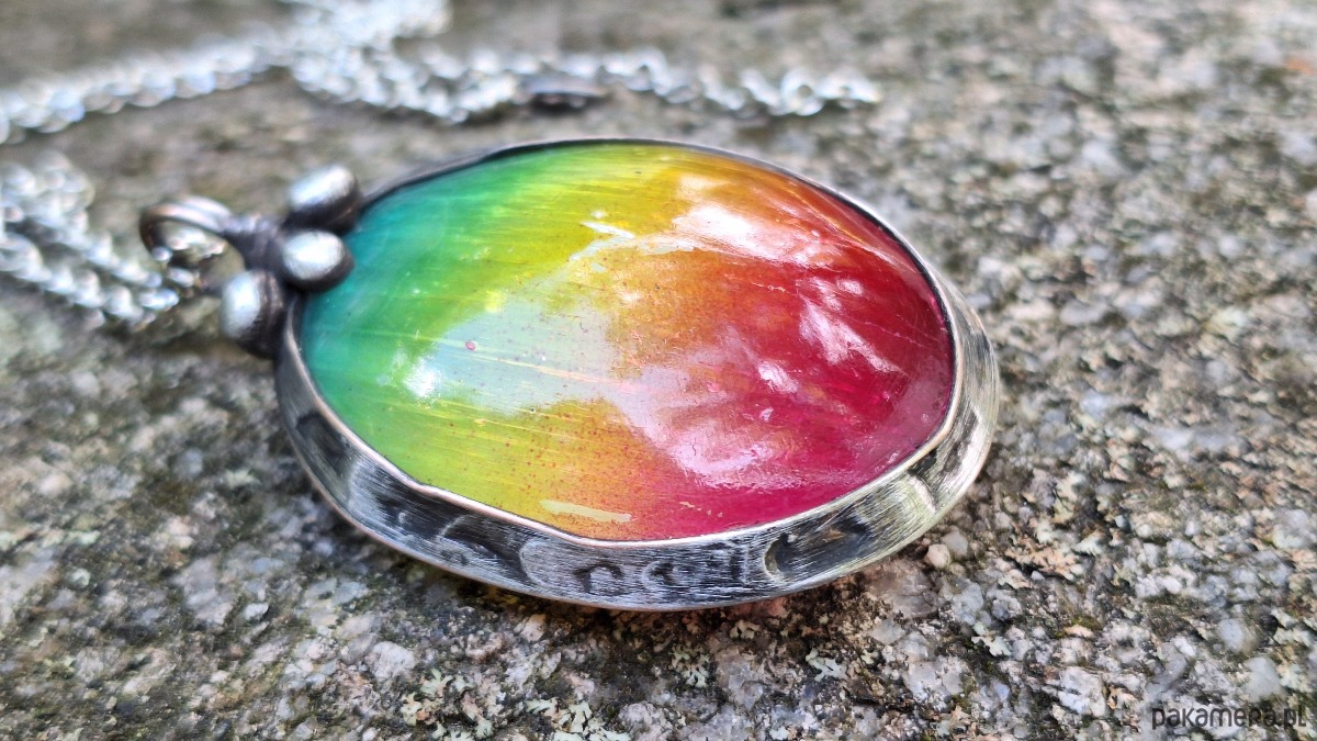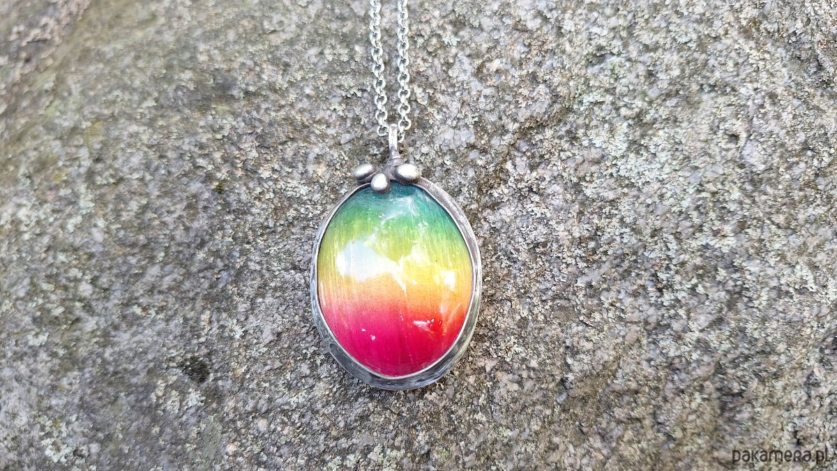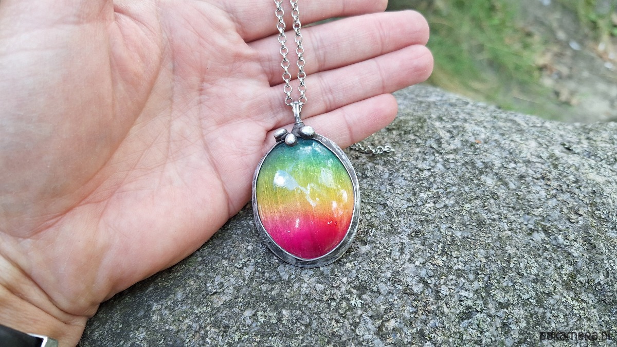 Wisiorek wykonany z miedzi, cyny i barwionego selenitu. Wymiary ok. 5 na 3.5 cm. Zawieszony na łańcuszku o długości ok. 50 cm. Kamień ma naturalne rysy i niedoskonałości.