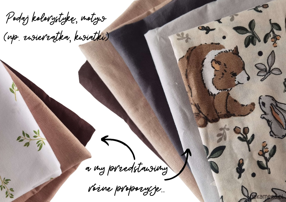 Wszystkie szczegóły ustalane są indywidualnie - kolor, wzór tkaniny, napis, czcionka itd. Czas oczekiwania od 2 do 5 dni.