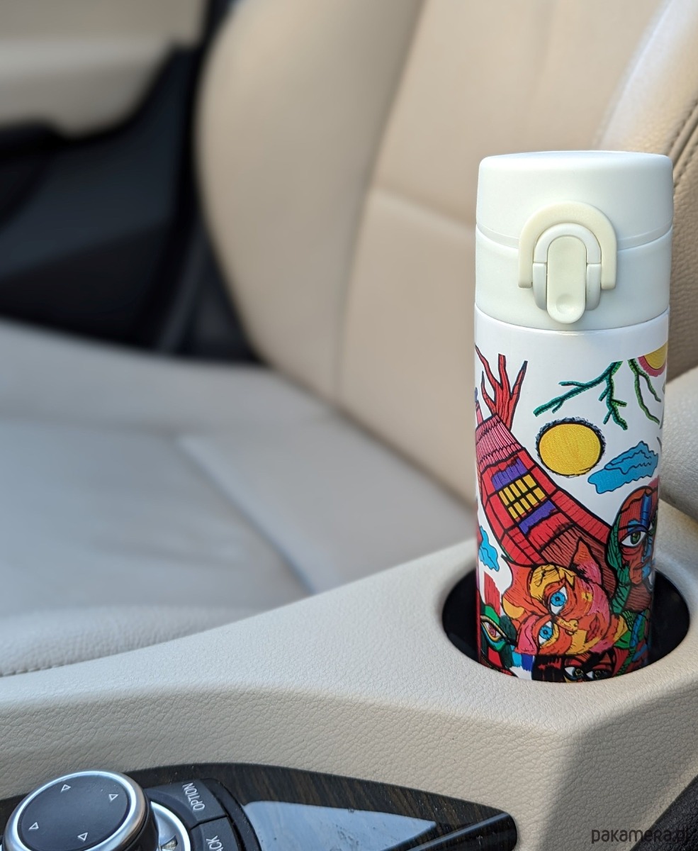 Kubek jest dwuściankowy, wykonany ze stali nierdzewnej. Nadruk wykonany techniką laserową UV. Kubek jest szczelny, nie przecieka nawet po postawieniu go do góry dnem. Trzyma ciepło do około 14 godzin, pojemność to 350 ml, wysokość kubka 23 cm, średnica 6 cm. Zalecane mycie ręczne.