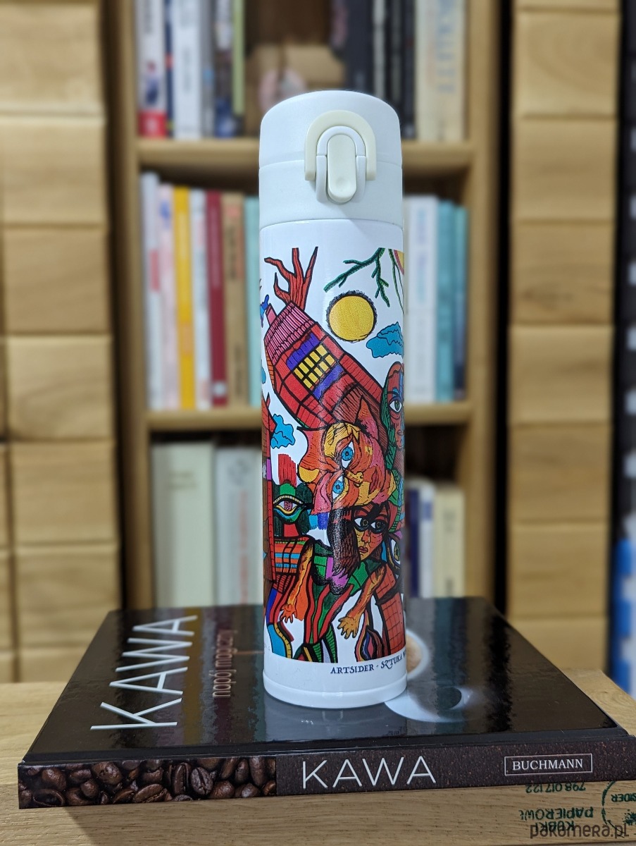 Kubek termiczny Artsider, organizacji wspierającej sztukę osób wykluczonych, na którym znajduje się wyjątkowy obraz pani Sylwii Mensfeld, chorującej na schizofrenię.