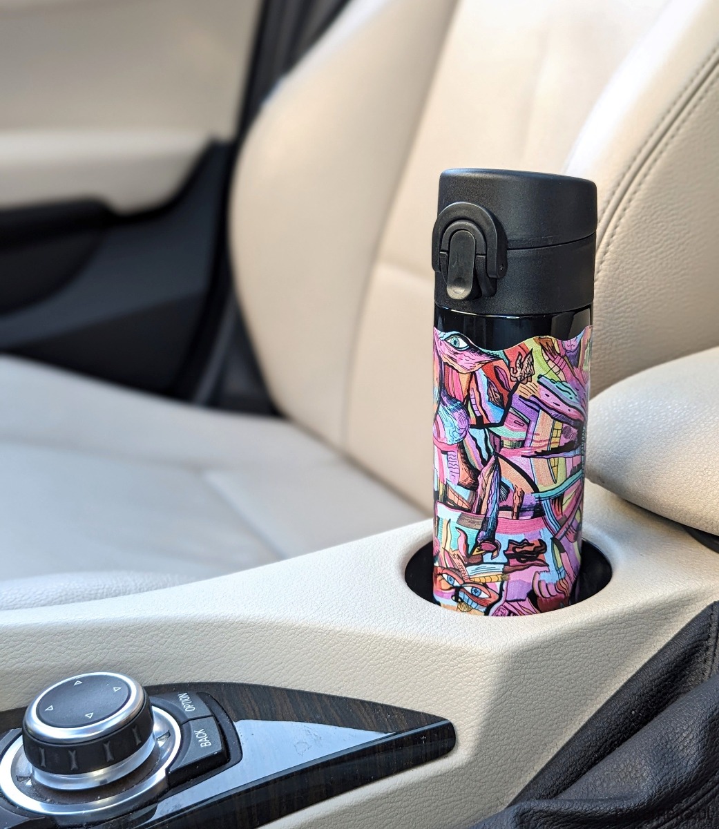 Kubek termiczny Artsider, organizacji wspierającej sztukę osób wykluczonych, na którym znajduje się wyjątkowy obraz pani Sylwii Mensfeld, chorującej na schizofrenię.