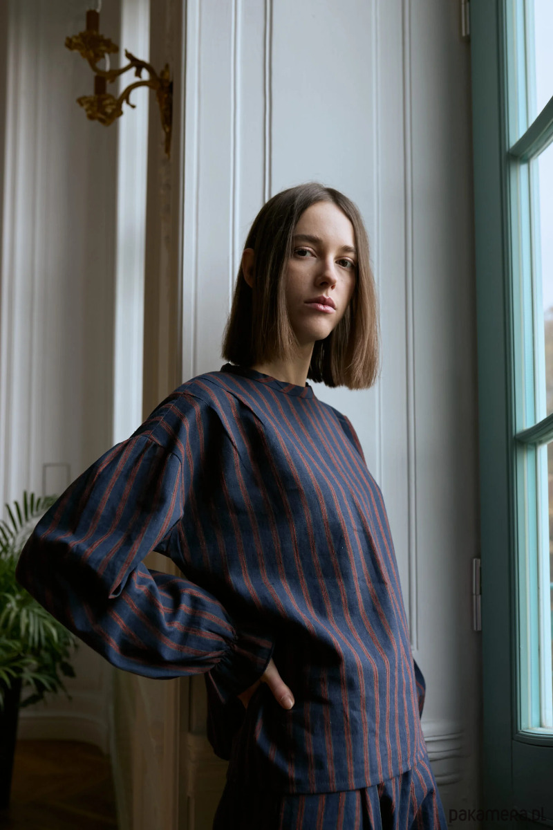 🪬Koszula Tessa uszyta została z certyfikowanej, naturalnej i gęsto tkanej bawełny z domieszką lnu. Wzór na tkaninie układa się w delikatne pasy. Połączenie odcieni czerwonej pomarańczy i granatu nadają stylowy, vintygowy wydźwięk tej koszuli.