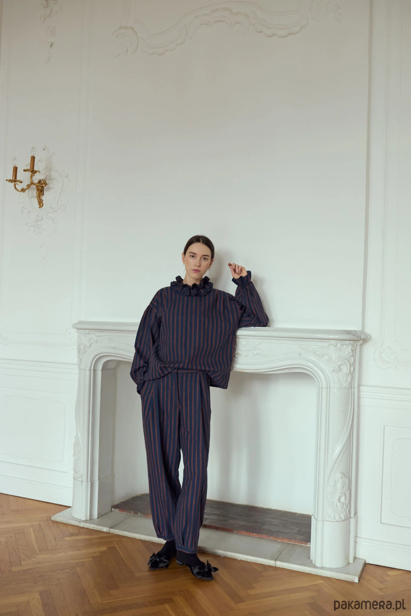 🪬 Spodnie uszyte zostały z certyfikowanej, naturalnej i gęsto tkanej bawełny z domieszką lnu. Wzór na tkaninę układa się w delikatne pasy.