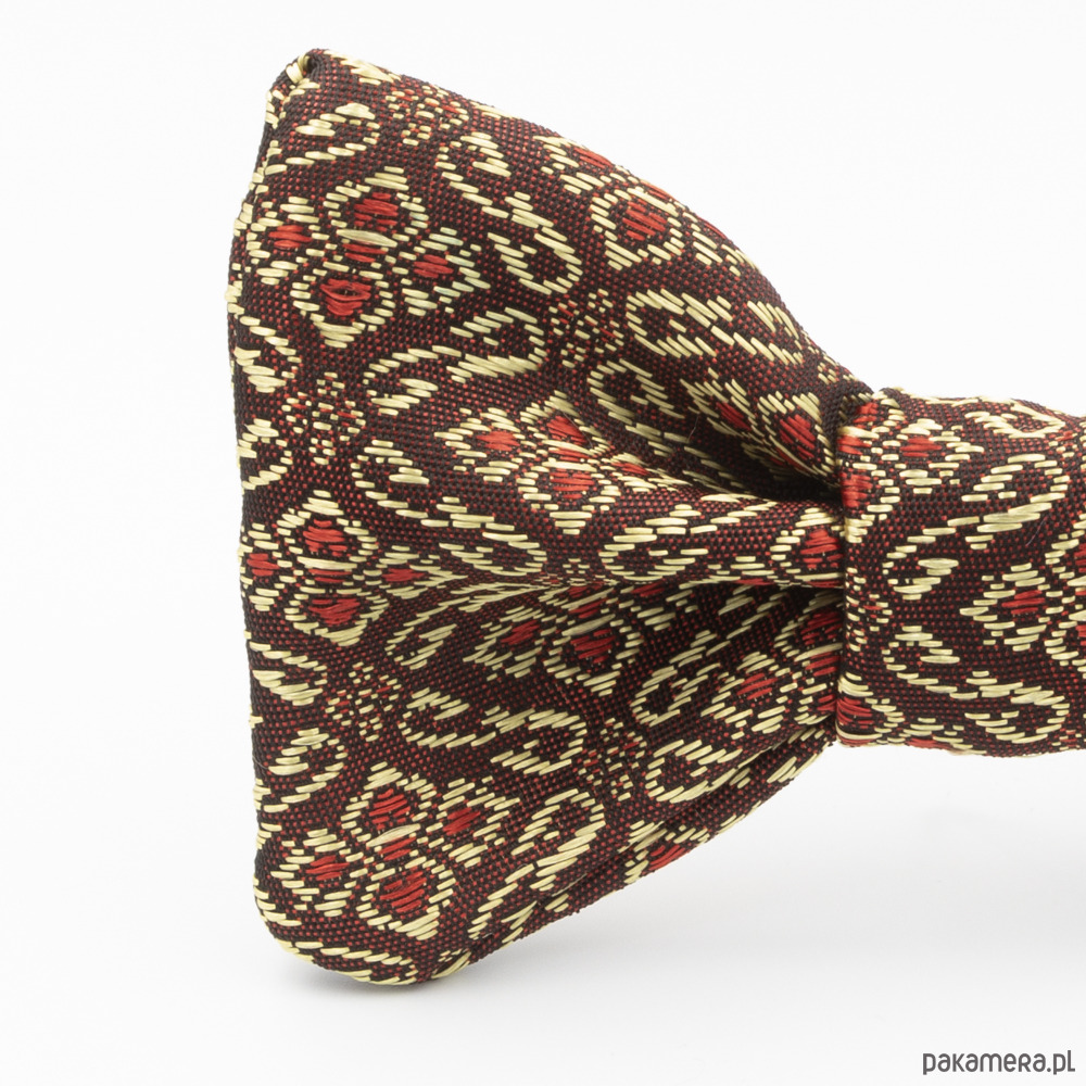Ta ręcznie szyta mucha w kolorze bordowym ze złotym przeszyciem z kolekcji Thai Style jest nieco inna od pozostałych, ponieważ zrobiona jest z materiału osobiście przywiezionego z Tajlandii. Na co dzień tajki szyją z niego przepiękne stroje na wszelkiego rodzaju ceremonie, parady i uroczystości dla kobiet i mężczyzn. Regulowane zapięcie na haczyk-motylek zapewnia wygodę noszenia i łatwość zakładania oraz zdejmowania. Poleca się zwłaszcza na specjalne, formalne okazje, a na co dzień będzie świetnie przełamywać biznesowy look.