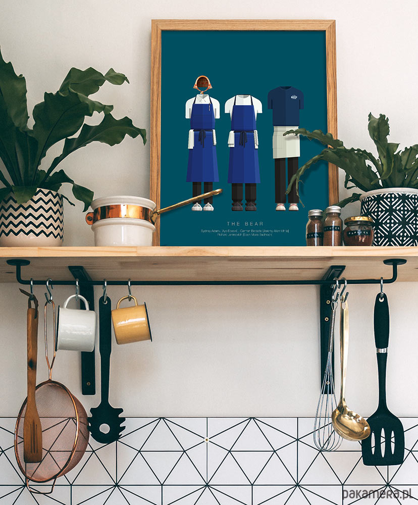 Plakat "The Bear" inspirowany obsypanym nagrodami serialem Christophera Storera doskonale sprawdzi się w jadalni, kuchni, bądź salonie. Rewelacyjna opowieść o próbach przekształcenia upadającego baru w znaczącą restaurację zachwyciła w równym stopniu widzów jak i krytyków. Bardzo kuchenny plakat z kostiumami głównych bohaterów: Carmy'ego, Richarda i Sydney to dekoracja dla każdego miłośnika zmagań genialnej ekipy.