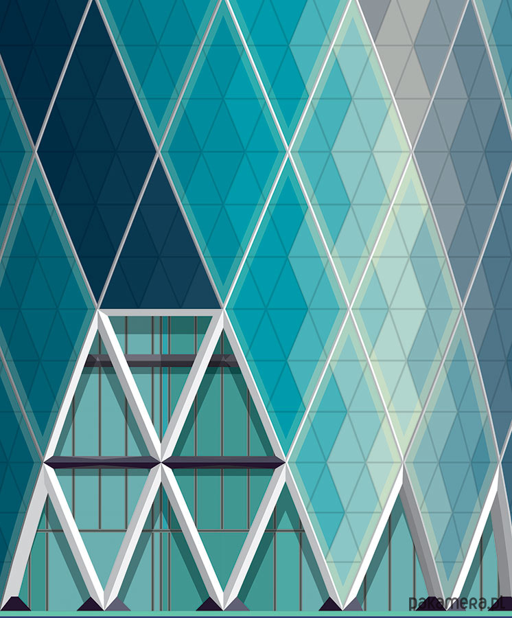 Plakat z autorską grafiką inspirowany wieżowcem 30 St Mary Axe, potocznie nazywanym The Gherkin (Korniszon). Pochodzi z serii "Dookoła Świata" i przedstawia monumentalny ikoniczny wieżowiec znajdujący się w City of London, głównej dzielnicy finansowej Londynu. Budynek zaprojektowany został przez inżyniera Normana Fostera.