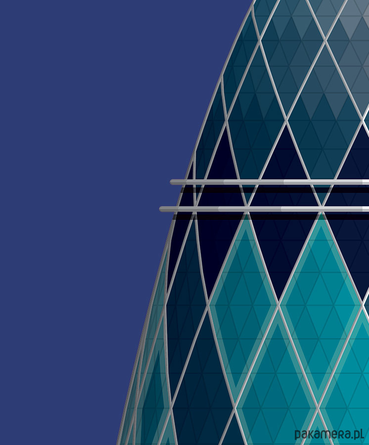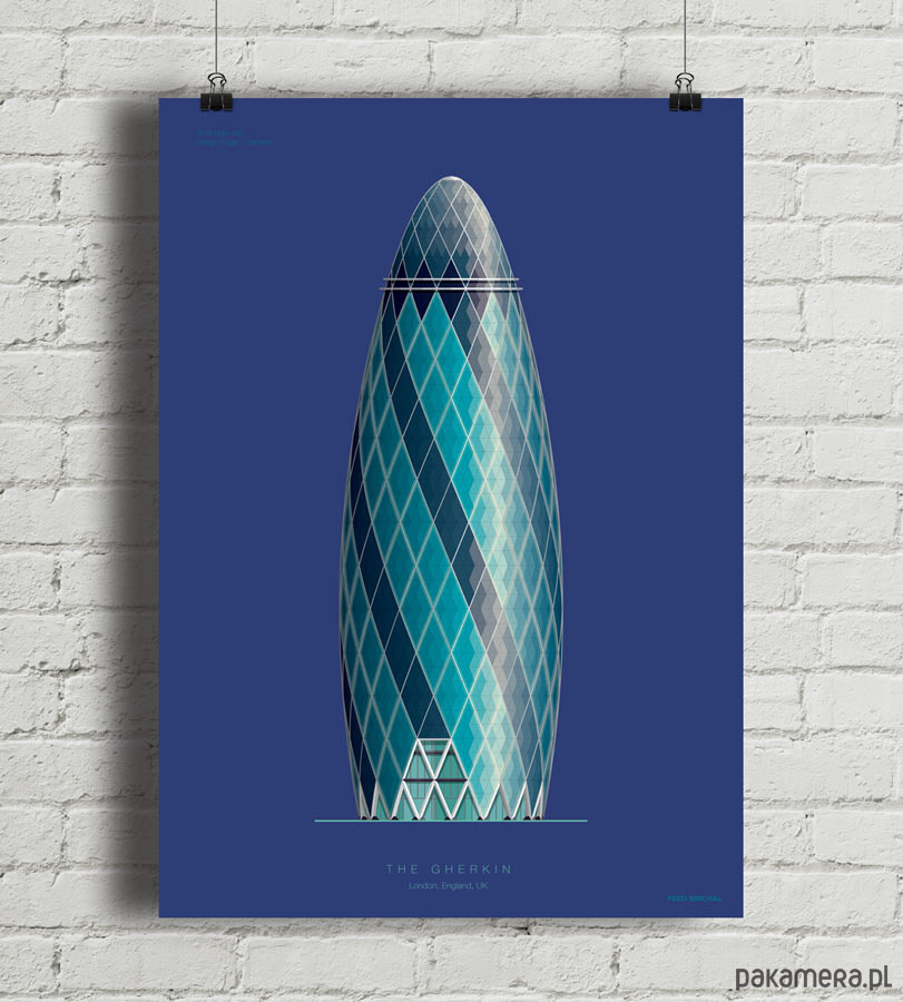 Plakat z autorską grafiką inspirowany wieżowcem 30 St Mary Axe, potocznie nazywanym The Gherkin (Korniszon). Pochodzi z serii "Dookoła Świata" i przedstawia monumentalny ikoniczny wieżowiec znajdujący się w City of London, głównej dzielnicy finansowej Londynu. Budynek zaprojektowany został przez inżyniera Normana Fostera.