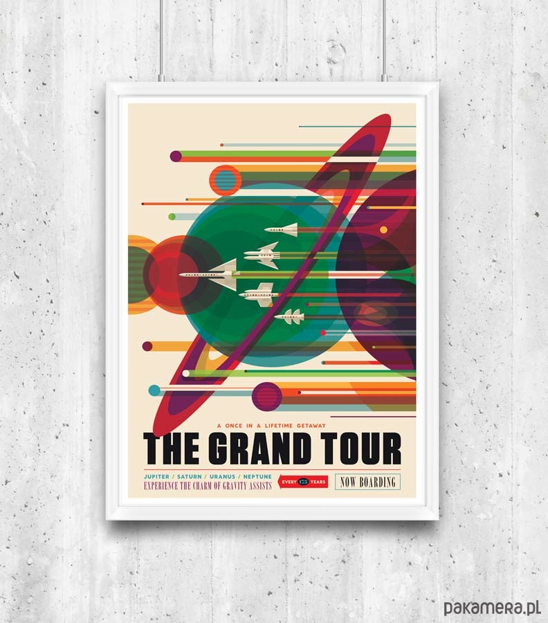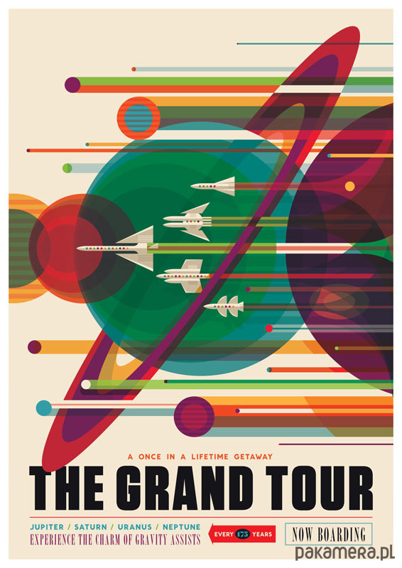 Plakat w stylu vintage przedstawiający wyprawę na planety Jupiter, Saturn, Uran i Neptun, reklamowaną sloganem "Jedyna w życiu okazja. Doświadcz uroku asyst grawitacyjnych - raz na 175 lat".