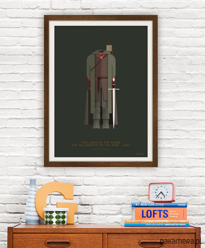 Plakat z autorską grafiką inspirowany filmem "Władca pierścieni: Drużyna Pierścienia" (The Lord of the Rings: The Fellowship of the Ring), reż. Peter Jackson. Pochodzi z serii "Cinema Costumes" (Kostiumy kinowe) i przedstawia strój Aragorna.