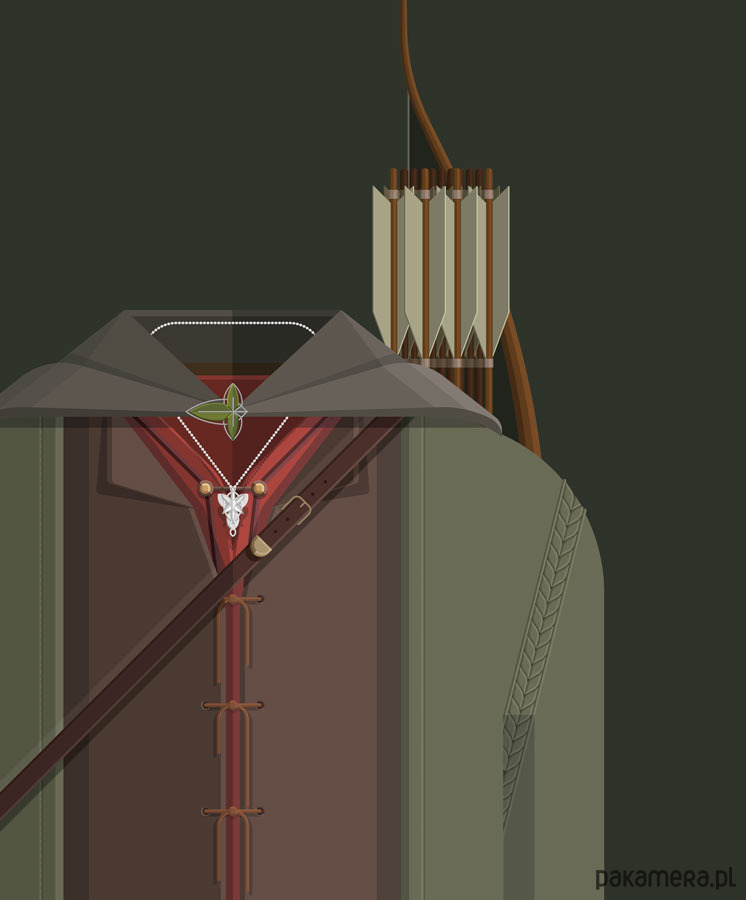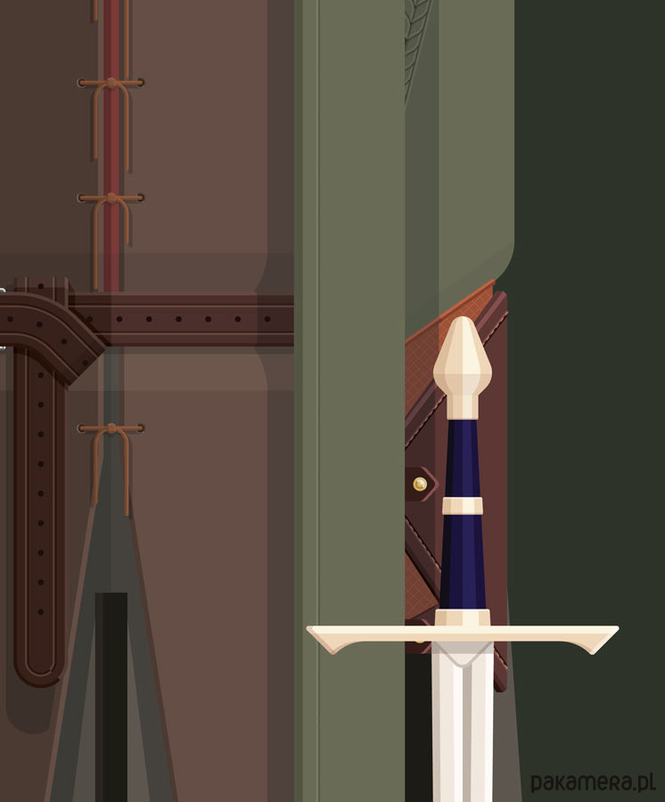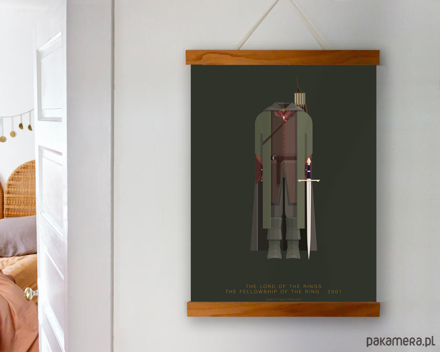 Plakat z autorską grafiką inspirowany filmem "Władca pierścieni: Drużyna Pierścienia" (The Lord of the Rings: The Fellowship of the Ring), reż. Peter Jackson. Pochodzi z serii "Cinema Costumes" (Kostiumy kinowe) i przedstawia strój Aragorna.