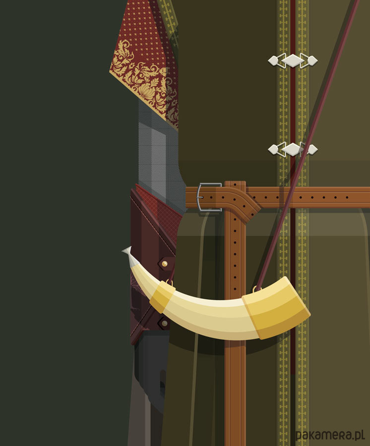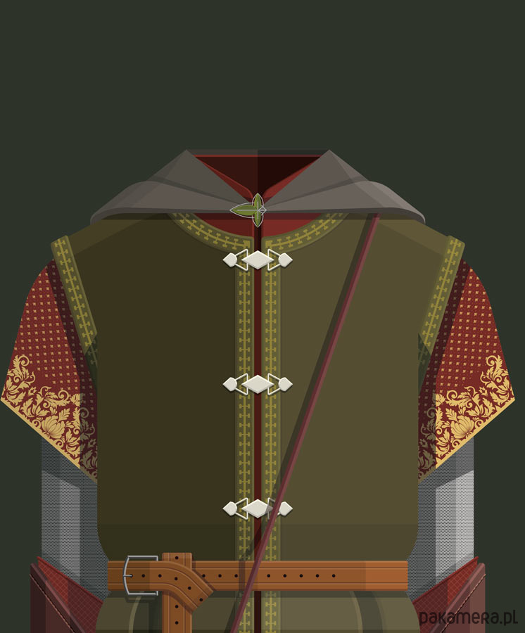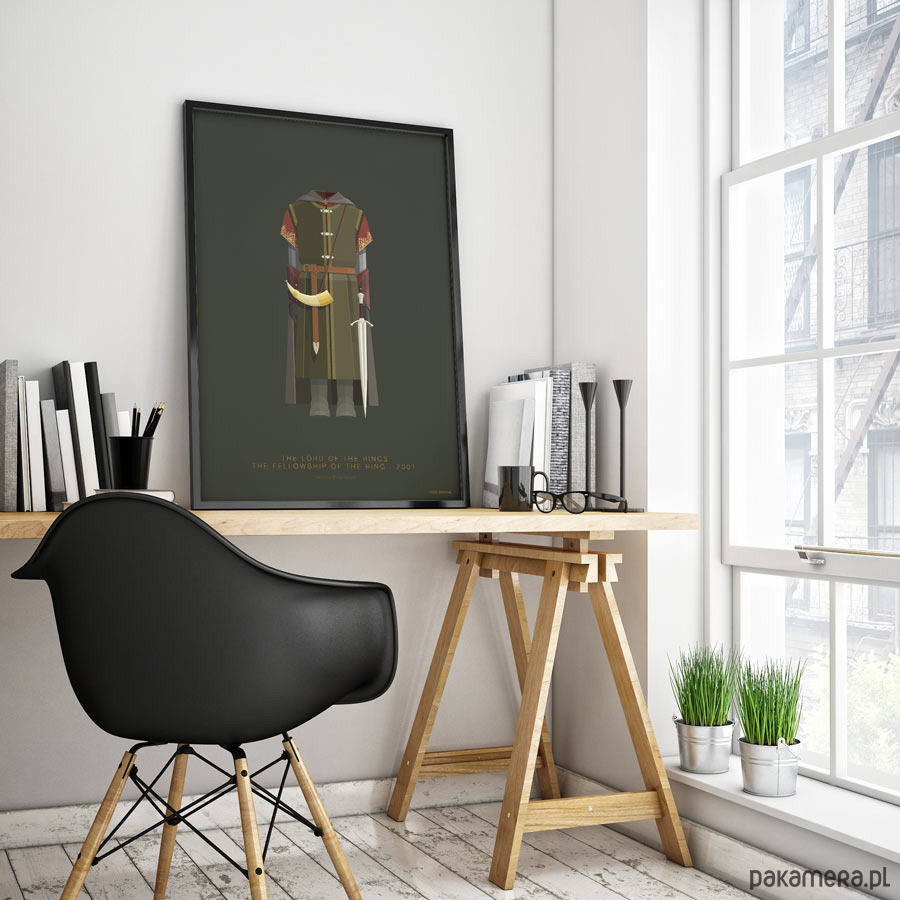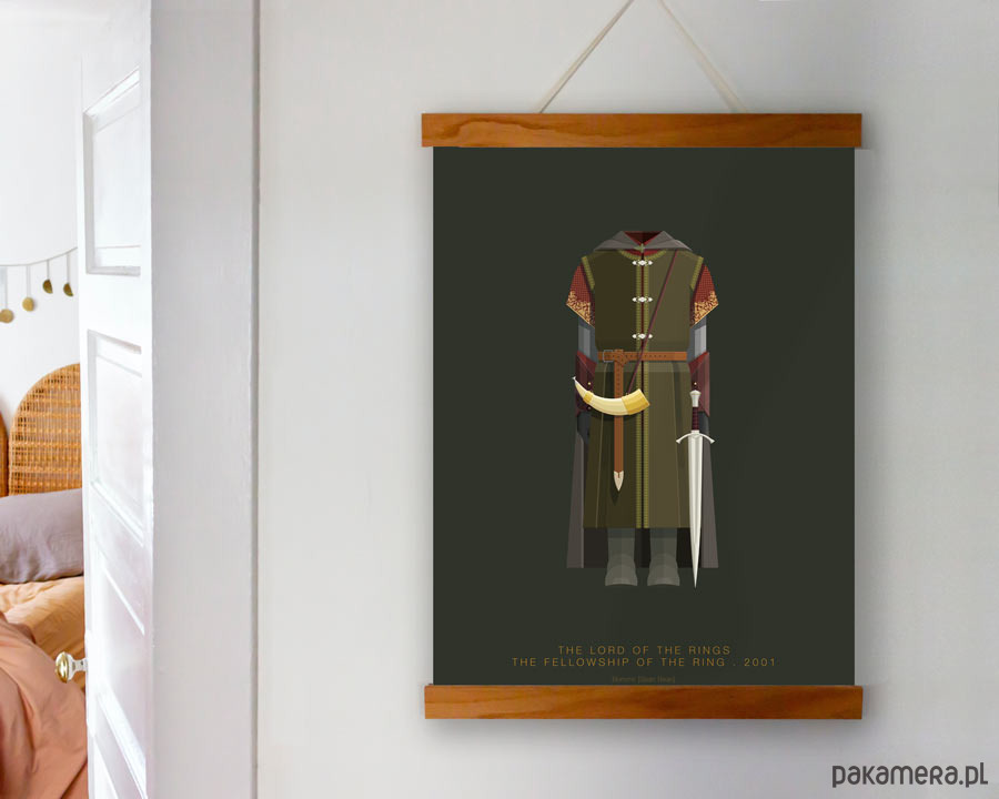 Plakat z autorską grafiką inspirowany filmem "Władca pierścieni: Drużyna Pierścienia" (The Lord of the Rings: The Fellowship of the Ring), reż. Peter Jackson. Pochodzi z serii "Cinema Costumes" (Kostiumy kinowe) i przedstawia strój Boromira.