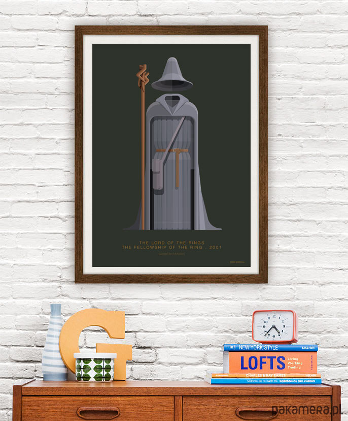Plakat z autorską grafiką inspirowany filmem "Władca pierścieni: Drużyna Pierścienia" (The Lord of the Rings: The Fellowship of the Ring), reż. Peter Jackson. Pochodzi z serii "Cinema Costumes" (Kostiumy kinowe) i przedstawia strój Gandalfa.
