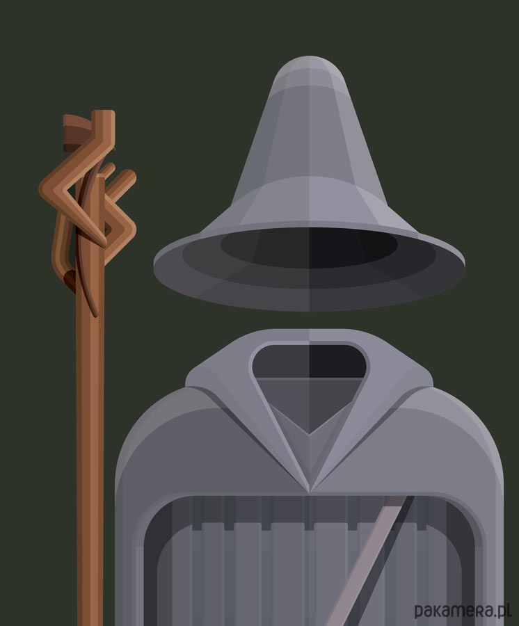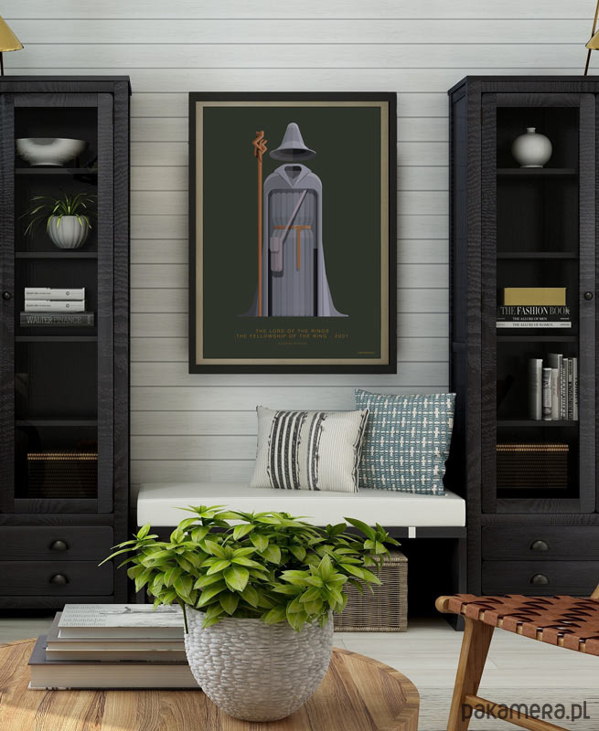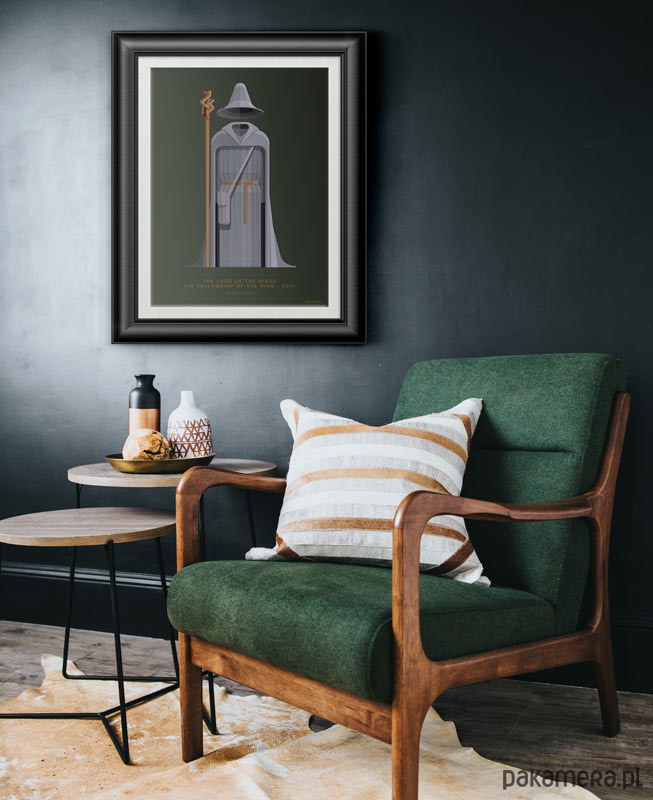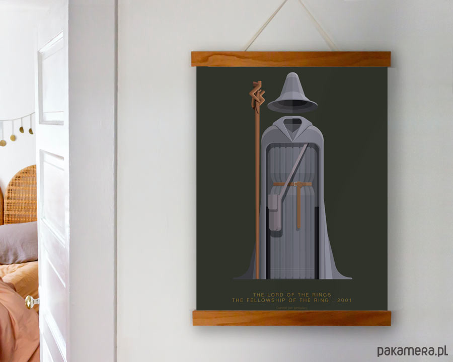 Plakat z autorską grafiką inspirowany filmem "Władca pierścieni: Drużyna Pierścienia" (The Lord of the Rings: The Fellowship of the Ring), reż. Peter Jackson. Pochodzi z serii "Cinema Costumes" (Kostiumy kinowe) i przedstawia strój Gandalfa.