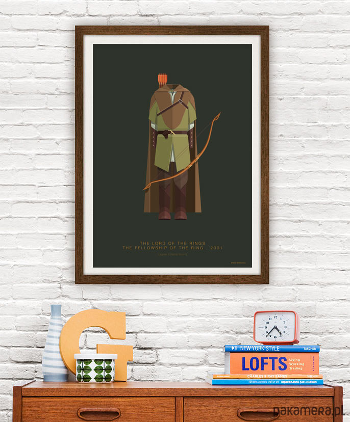 Plakat z autorską grafiką inspirowany filmem "Władca pierścieni: Drużyna Pierścienia" (The Lord of the Rings: The Fellowship of the Ring), reż. Peter Jackson. Pochodzi z serii "Cinema Costumes" (Kostiumy kinowe) i przedstawia strój Legolasa.