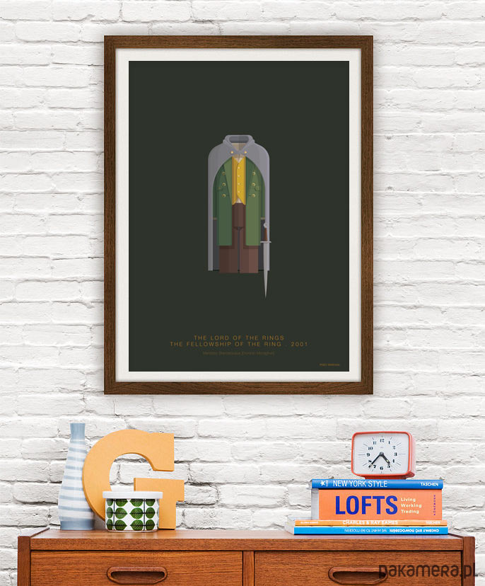 Plakat z autorską grafiką inspirowany filmem "Władca pierścieni: Drużyna Pierścienia" (The Lord of the Rings: The Fellowship of the Ring), reż. Peter Jackson. Pochodzi z serii "Cinema Costumes" (Kostiumy kinowe) i przedstawia strój Merrego.