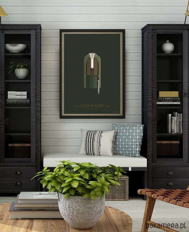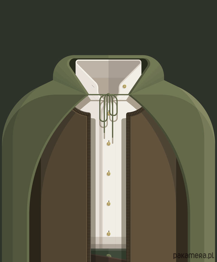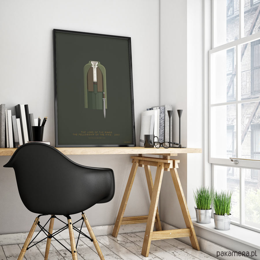 Plakat z autorską grafiką inspirowany filmem "Władca pierścieni: Drużyna Pierścienia" (The Lord of the Rings: The Fellowship of the Ring), reż. Peter Jackson. Pochodzi z serii "Cinema Costumes" (Kostiumy kinowe) i przedstawia strój Sama Gamgee.