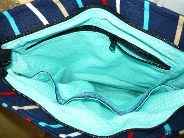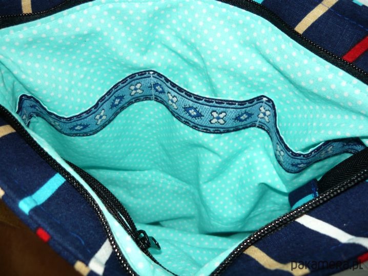 Wewnątrz dopasowana kolorystycznie podszewka oraz jedna kieszeń zamykana na zamek i dodatkowo trzy mniejsze otwarte kieszonki wykończone ozdobną taśmą.
