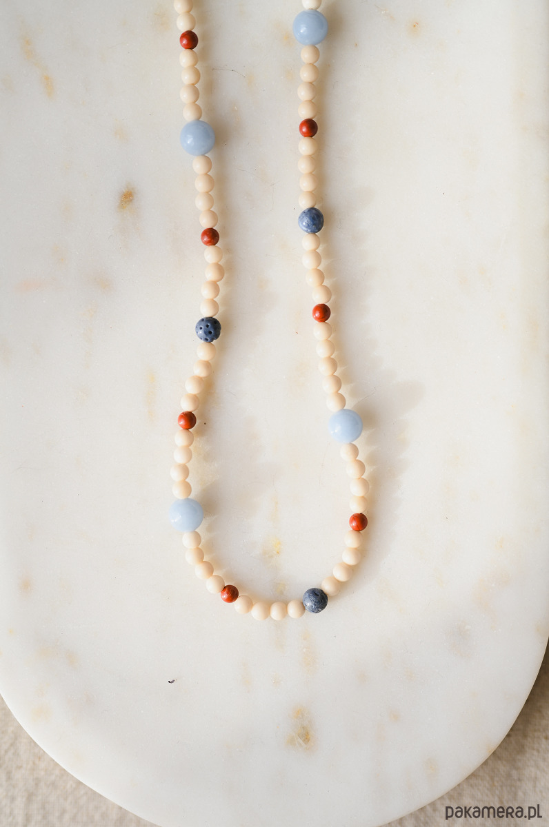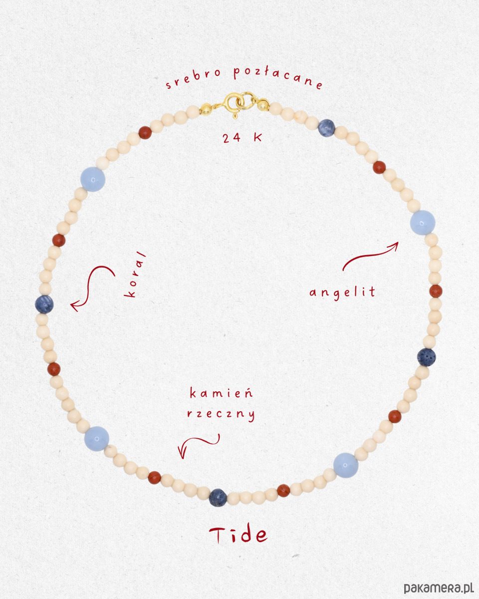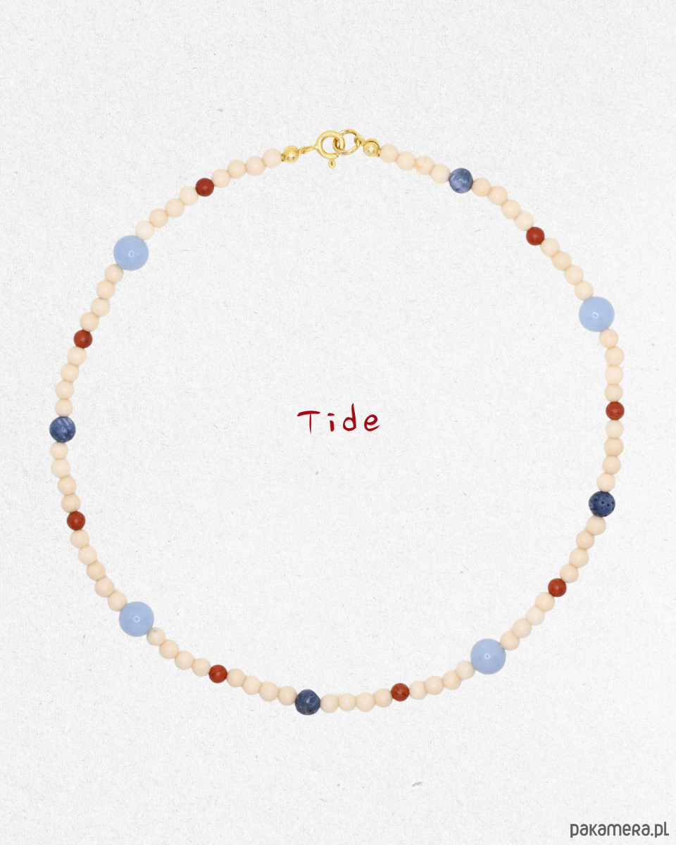 Tide to naszyjnik inspirowany rytmem morza - spokojną linią brzegu, jasnym piaskiem i kontrastem błękitu z ciepłym akcentem czerwieni. To kompozycja subtelna, ale wyrazista, przywodząca na myśl letnie światło i nadmorską świeżość.