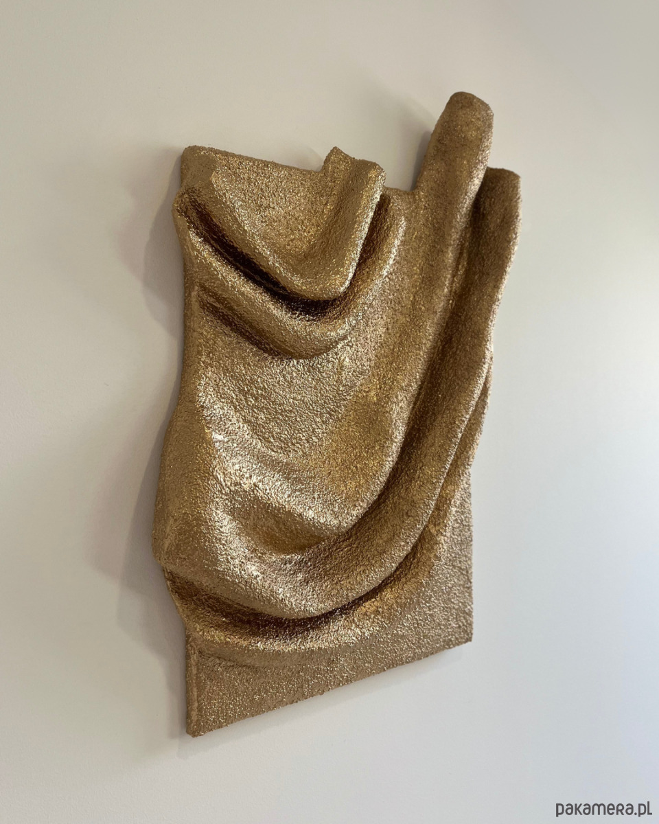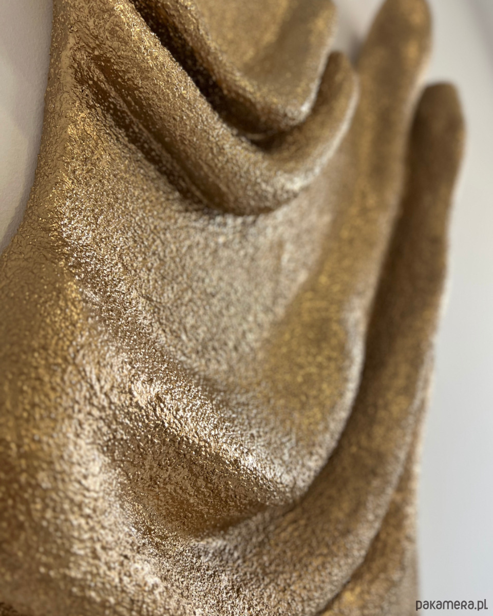 Statyczna eksplozja form, tekstur i głębi. Nasze unikatowe, ręcznie wykonane rzeźby ścienne zmieniają się w zależności od punktu widzenia obserwatora. Niektóre detale wydają się być ukryte, a po chwili stają się wyraźne i dominujące. Autorska mieszanka gipsu została wykorzystana w sposób, który doskonale imituje charakterystyczną strukturę tkaniny boucle. Delikatne “pętelki” i nierówności sprawiają, że rzeźba nabiera życia, tworząc efekt głębi i trójwymiarowości, jest pełna dynamizmu, choć w rzeczywistości pozostaje nieruchoma. Kolorystyka jest stonowana i naturalna, pasująca idealnie do estetyki wabi-sabi.