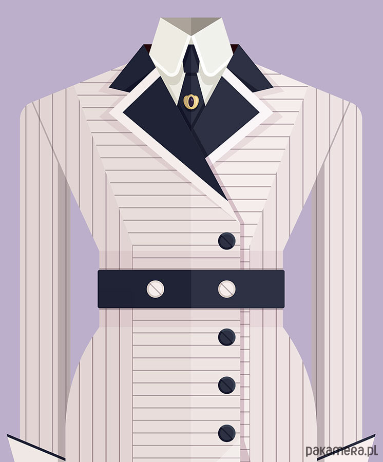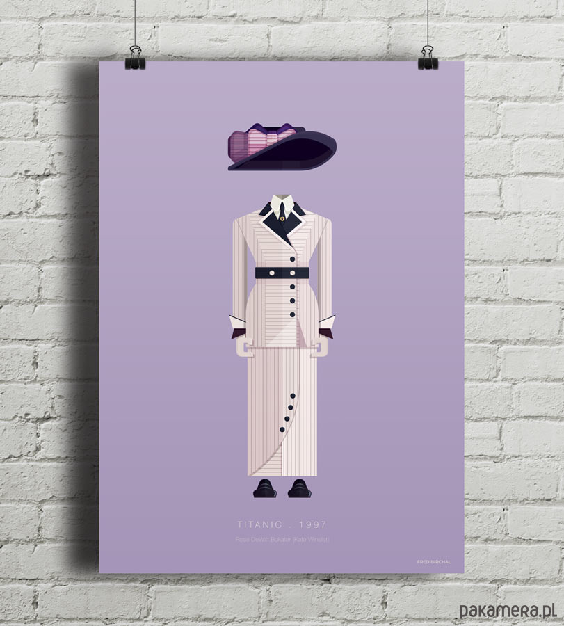Plakat z autorską grafiką inspirowaną filmem "Titanic", reż. James Cameron. Pochodzi z serii "Cinema Costumes" (Kostiumy kinowe) i przedstawia strój Rose DeWitt Bukater.