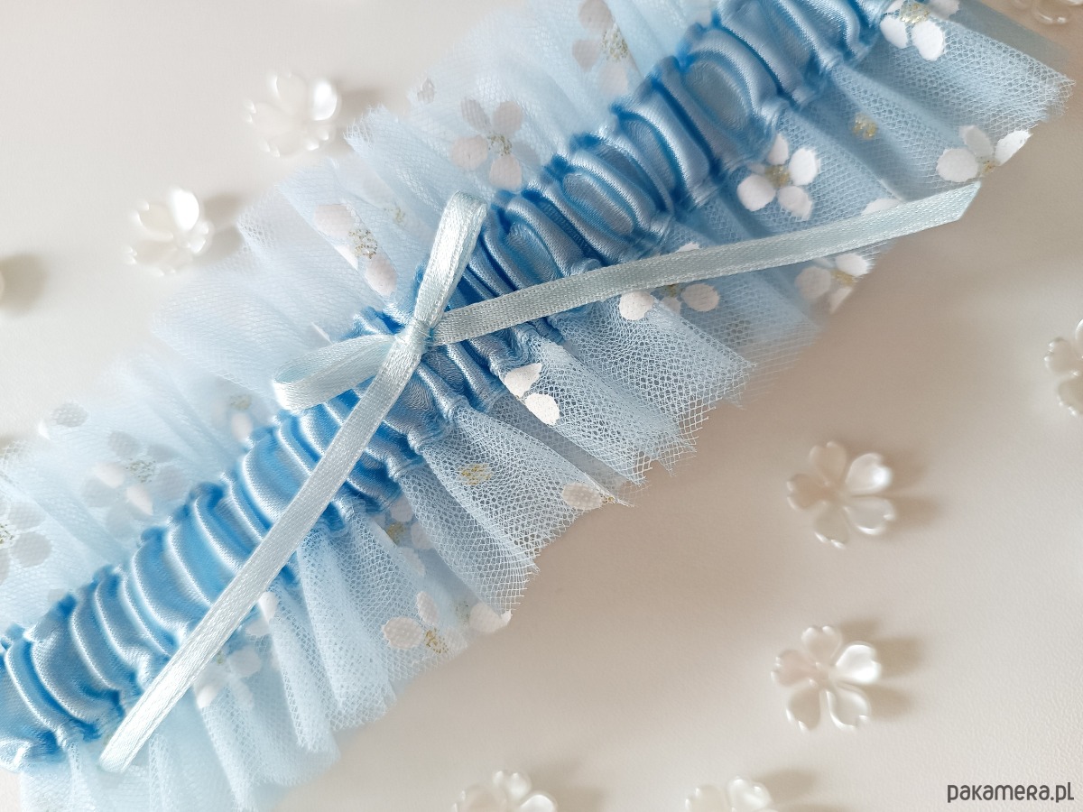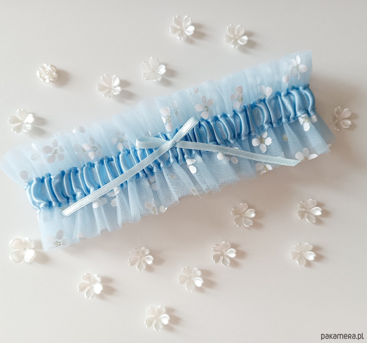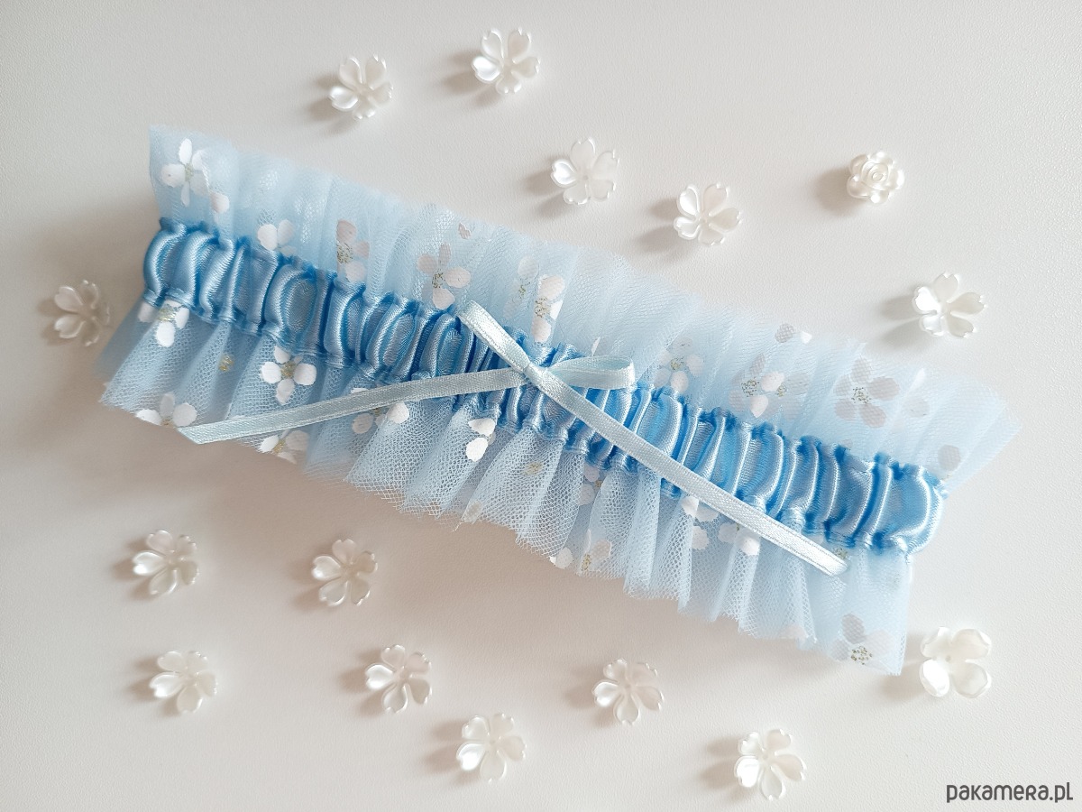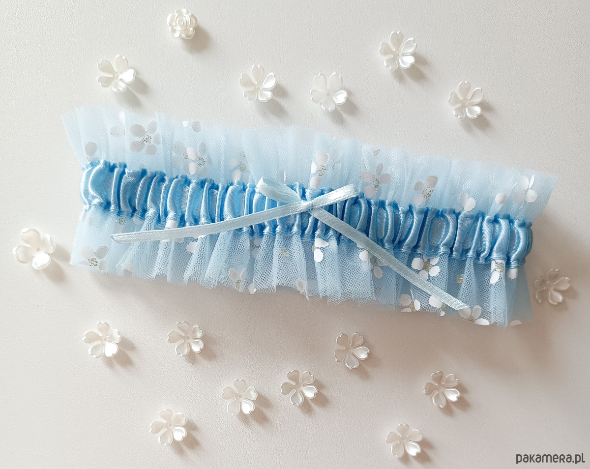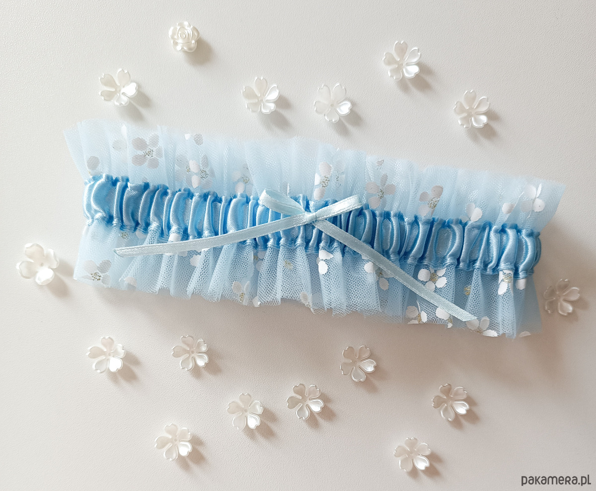Po środku podwiązki została doszyta kokardka w kolorze błękitu.