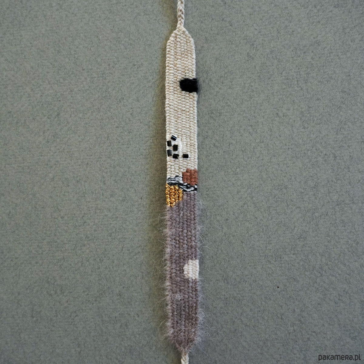 Bransoletka ręcznie robiona na krośnie. Kolorystyka bardzo neutralna, różnorodne, ciekawe faktury nici i włóczek, dodatkowo szklane koraliki. Szerokość 1 do 1,5 cm. Długość części tkanej 14,15 cm plus sznureczki do samodzielnego wiązania na supełek (należy go mocno zawiązać). Bransoletka jest estetycznie zapakowana, gotowa do wręczenia np. na prezent :) Polecam serdecznie ♡