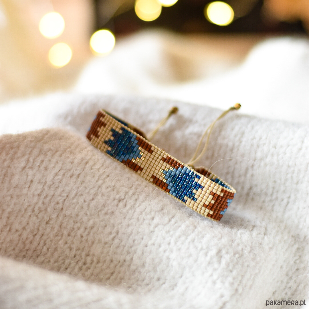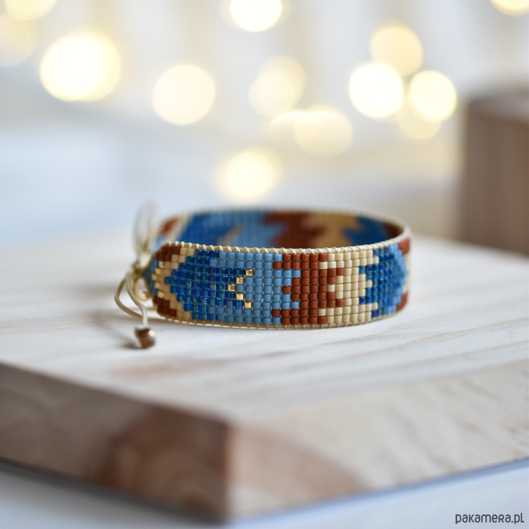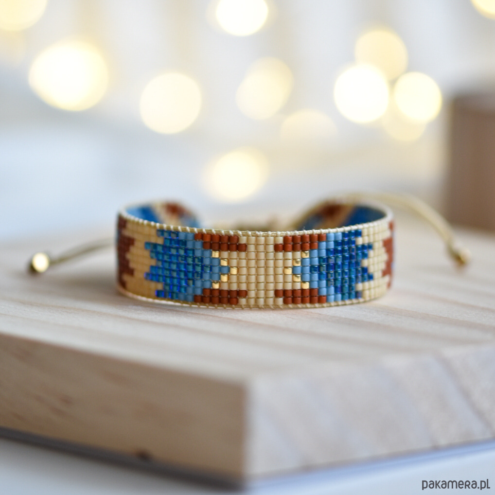 Wyjątkowa, ręcznie tkana bransoletka inspirowana geometrycznymi motywami kultury azteckiej. Połączenie naturalnego beżu, ciepłego rudego oraz dwóch odcieni niebieskiego – klasycznego i morskiego – tworzy harmonijną, a jednocześnie wyrazistą kompozycję kolorystyczną.