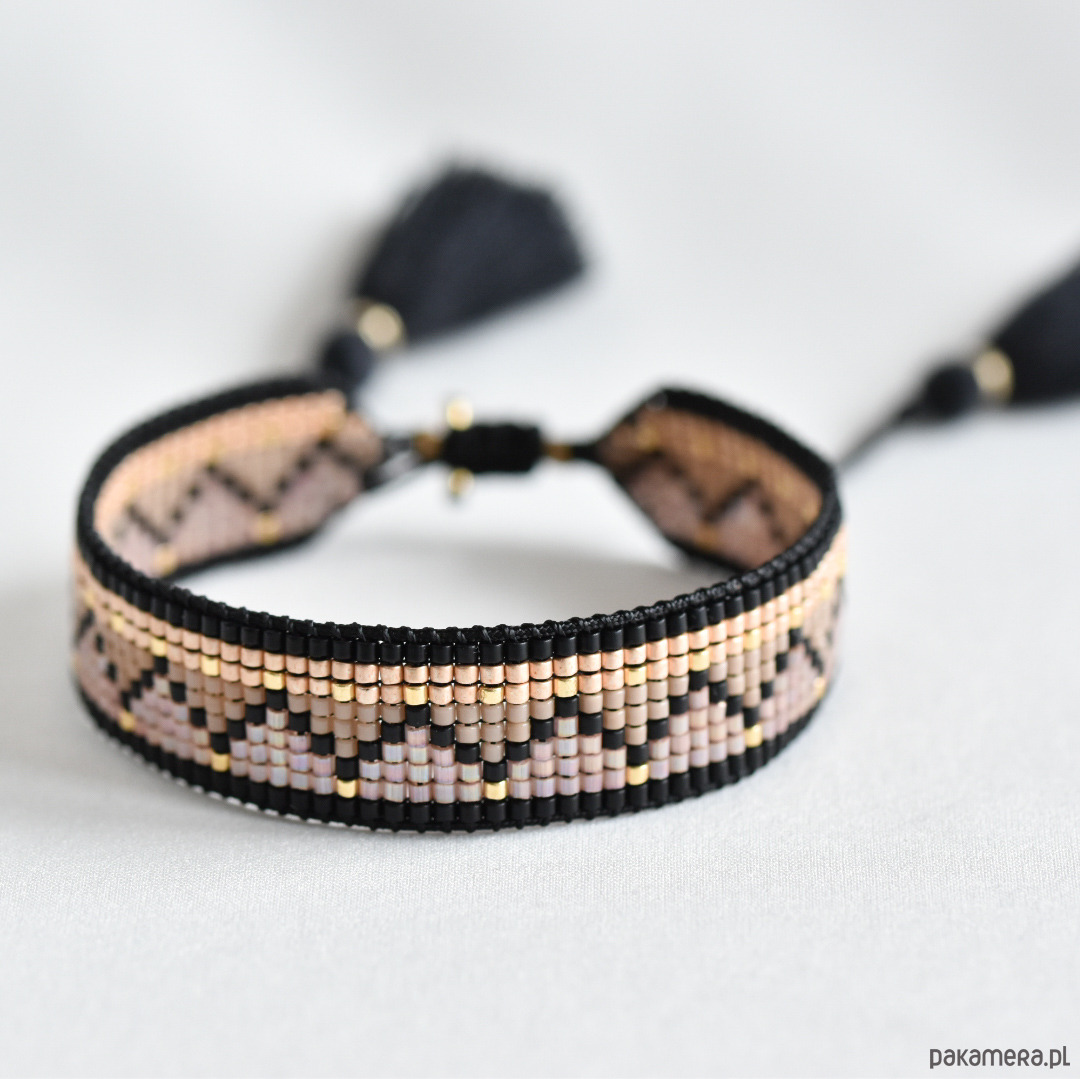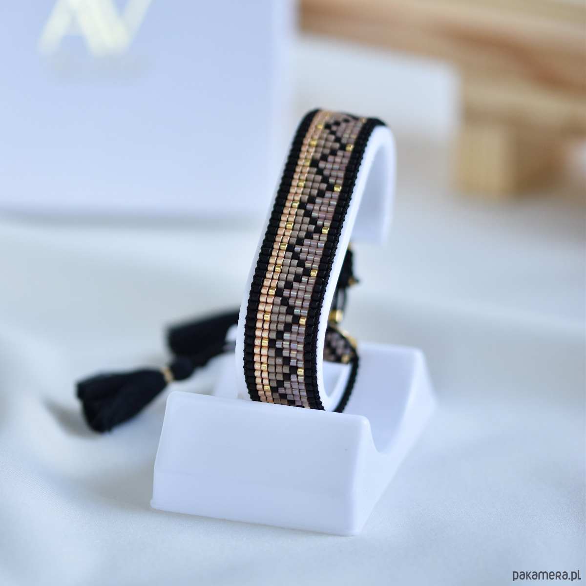 Bransoletka tkana na krośnie tkackim z cylindrycznych, wysokiej jakości koralików Miyuki. Ozdobiona zawieszką ze stali szlachetnej z logo marki, może być zakończona chwościkami lub złotymi kostkami.