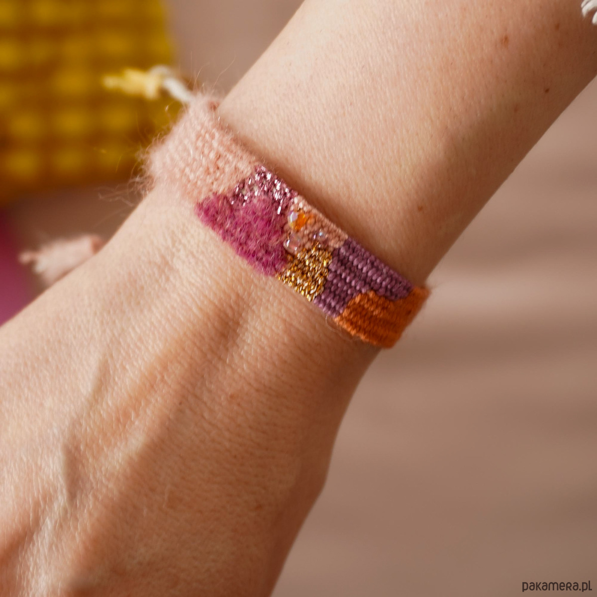 Prześliczna tkana ręcznie bransoletka w bajecznej, ciepłej kolorystyce z błyszczącymi wstawkami i koralikami szklanymi. Szerokość części tkanej to niecałe 1,5 cm, długość części tkanej to około 14, 15 cm.