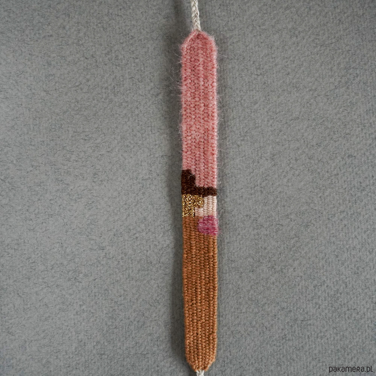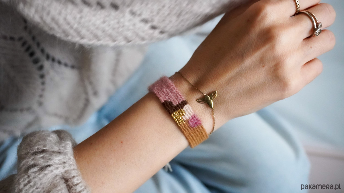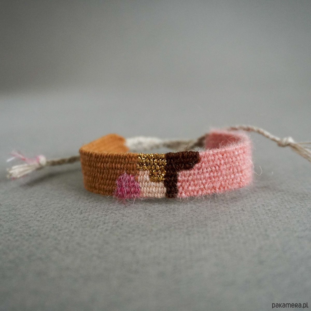 Wyjątkowa bransoletka ręcznie wykonana na krośnie w ciepłych, jesiennych odcieniach różu i rudości 🍁. Szerokość około 1,5 cm , długość części tkanej około 14,15 cm plus sznureczki do samodzielnego wiązania. Polecam serdecznie ♡. Bransoletka jest estetycznie zapakowana, gotowa do wręczenia na prezent 🩷