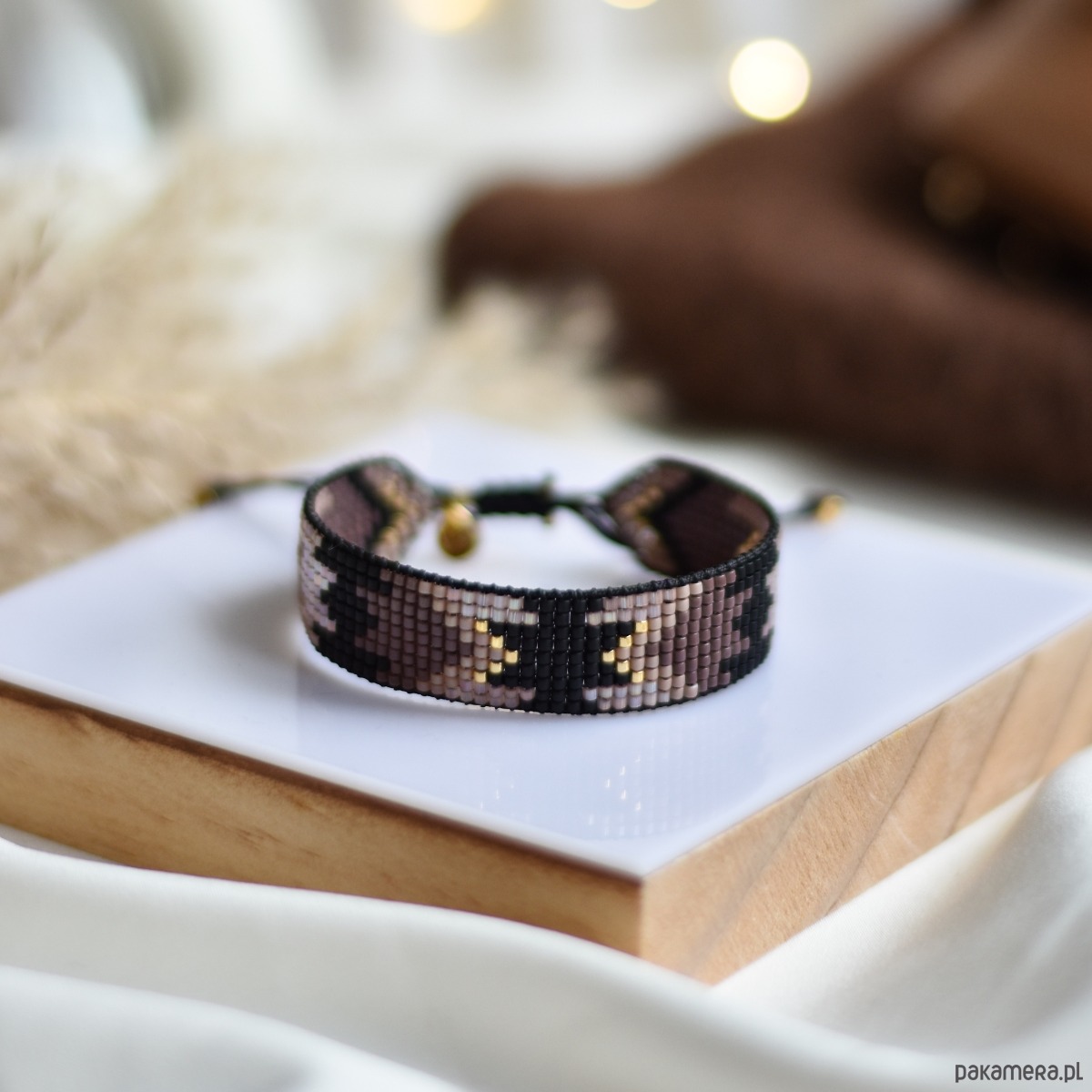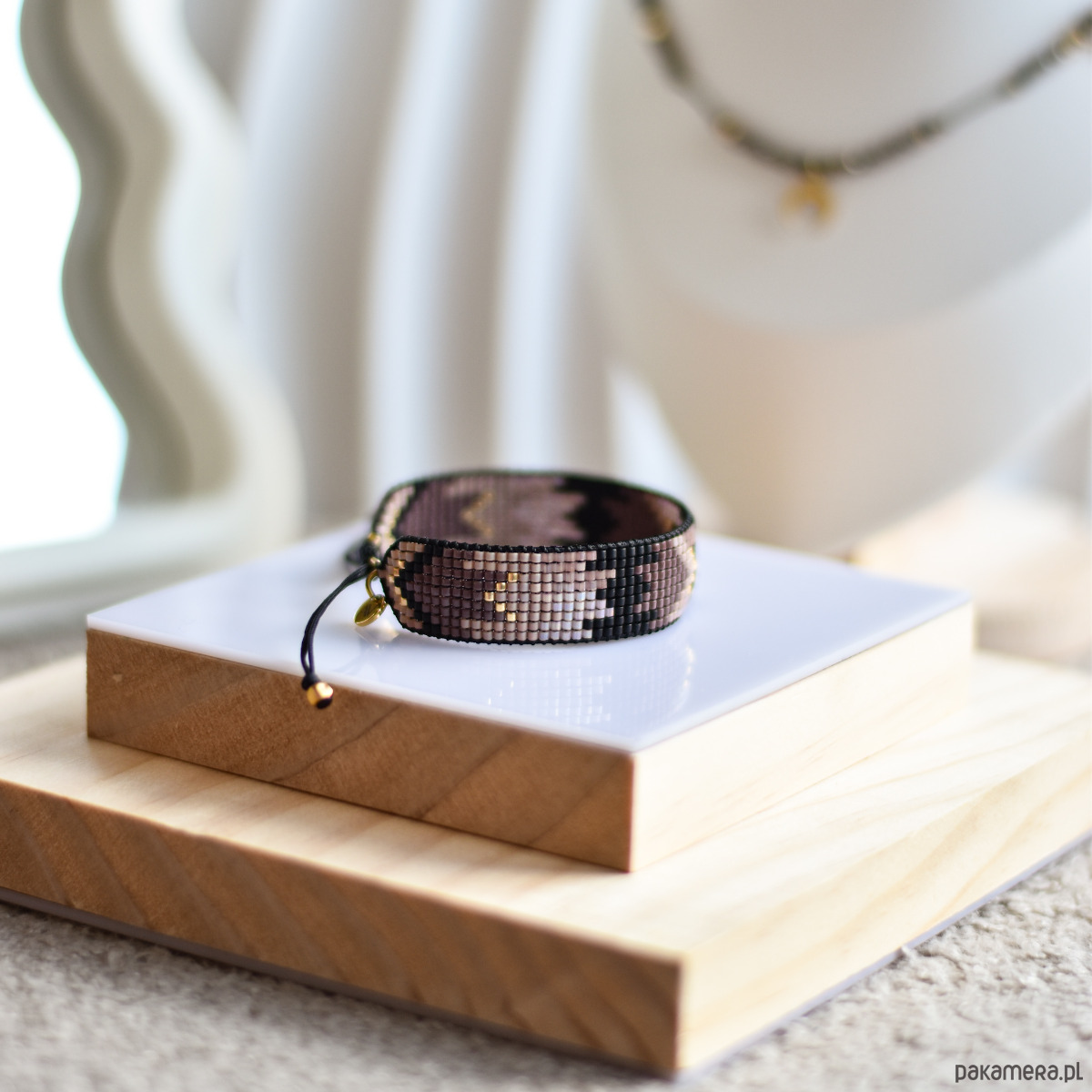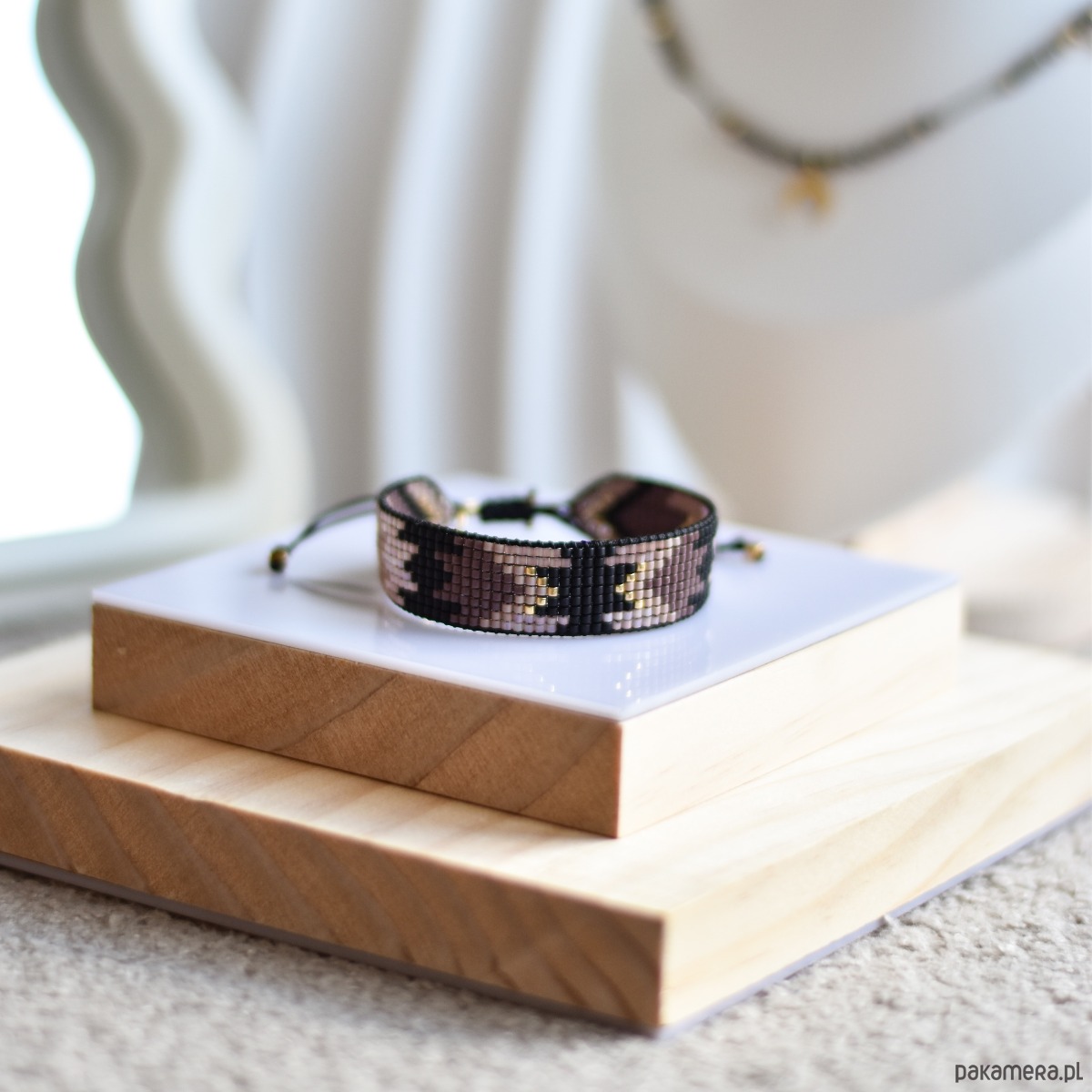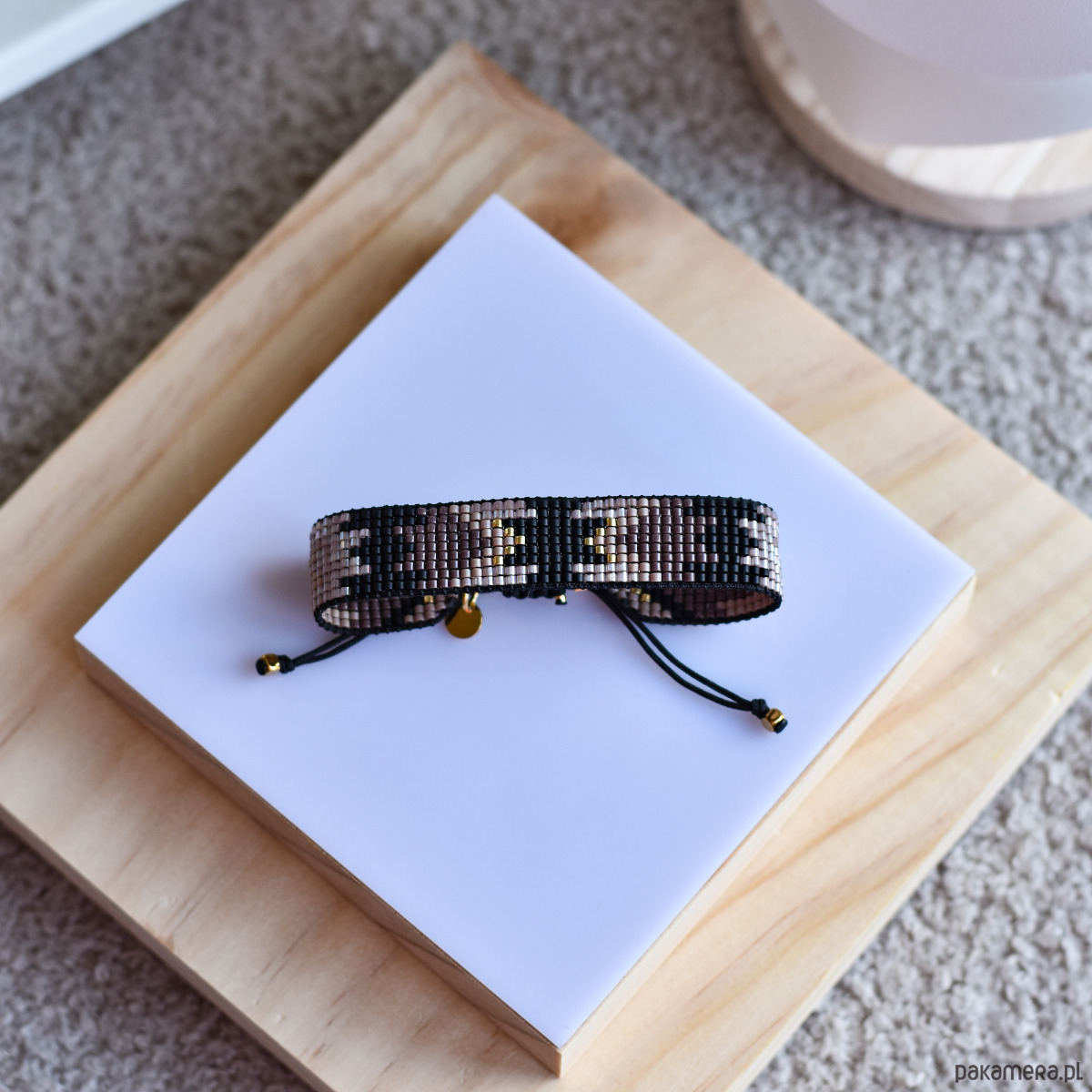 Tkana na krośnie bransoletka z cylindrycznych, wysokiej jakości koralików Miyuki z zawieszką ze stali szlachetnej z logo marki.