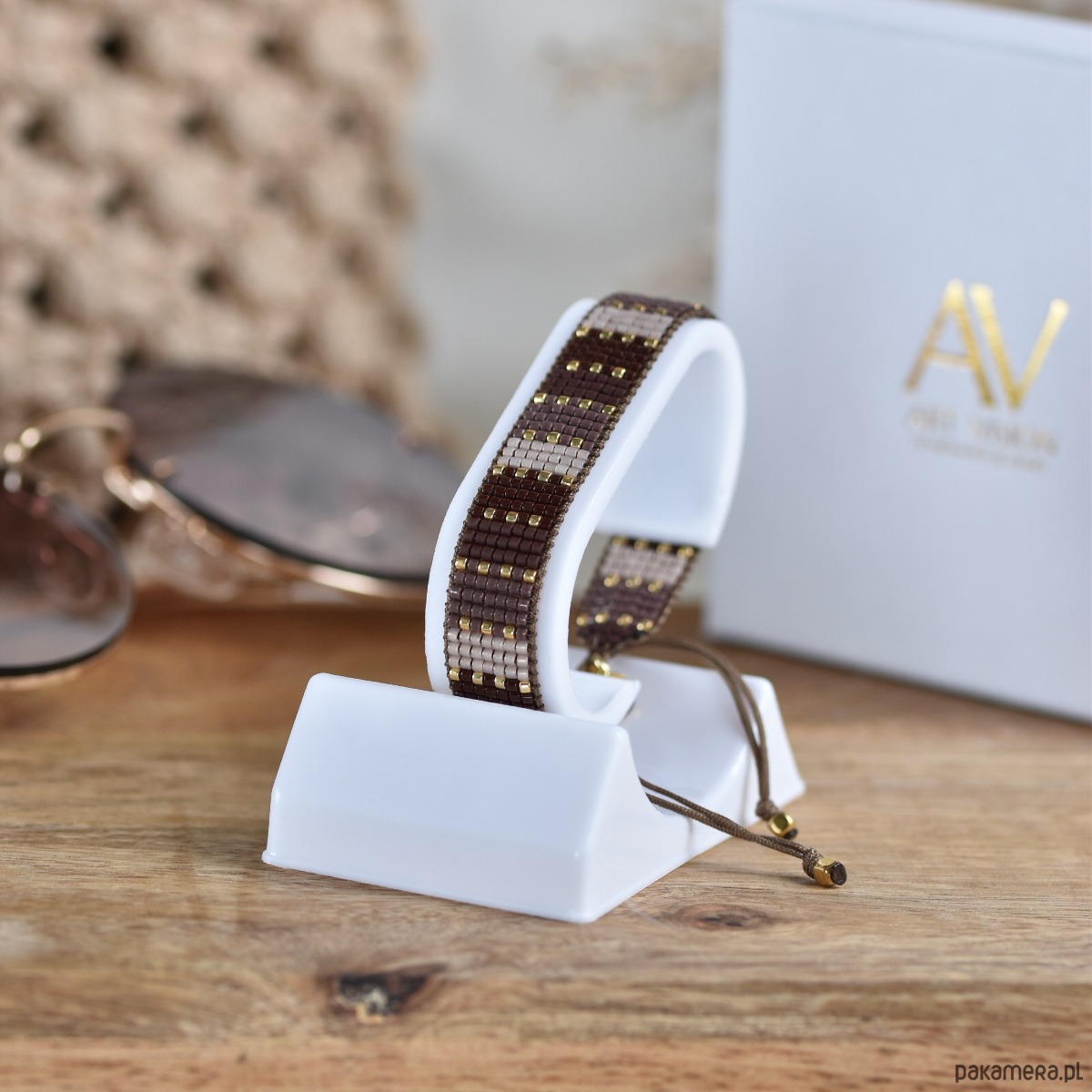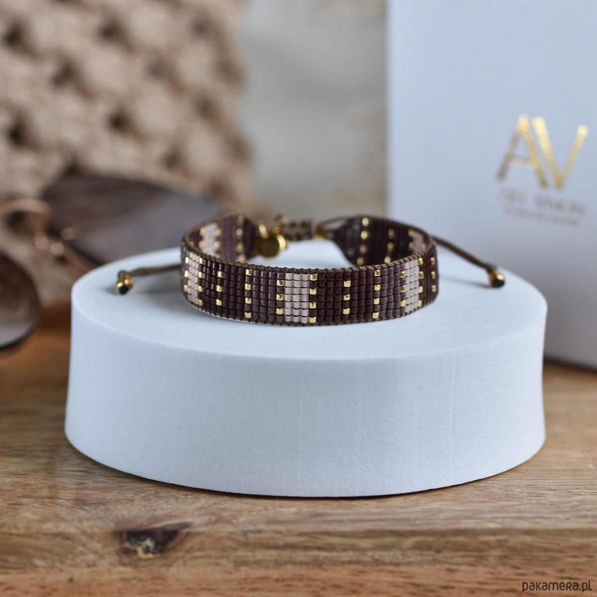 Ręcznie tkana na krośnie bransoletka MOCHA GLOW łączy modny design z wyjątkową paletą kolorów. Wykonana z najwyższej jakości japońskich koralików Miyuki, zachwyca ciepłymi odcieniami bardzo obecnie modnych brązów i beży, subtelnie przełamanych złotym akcentem.
