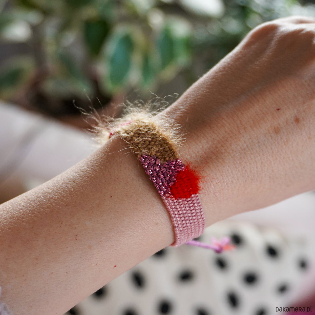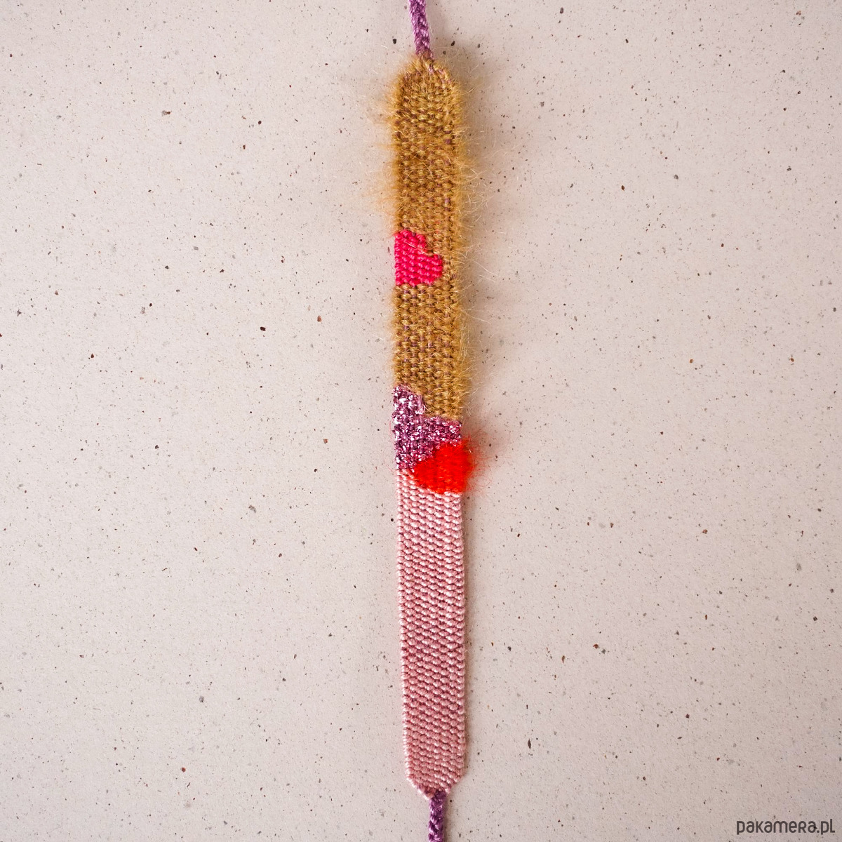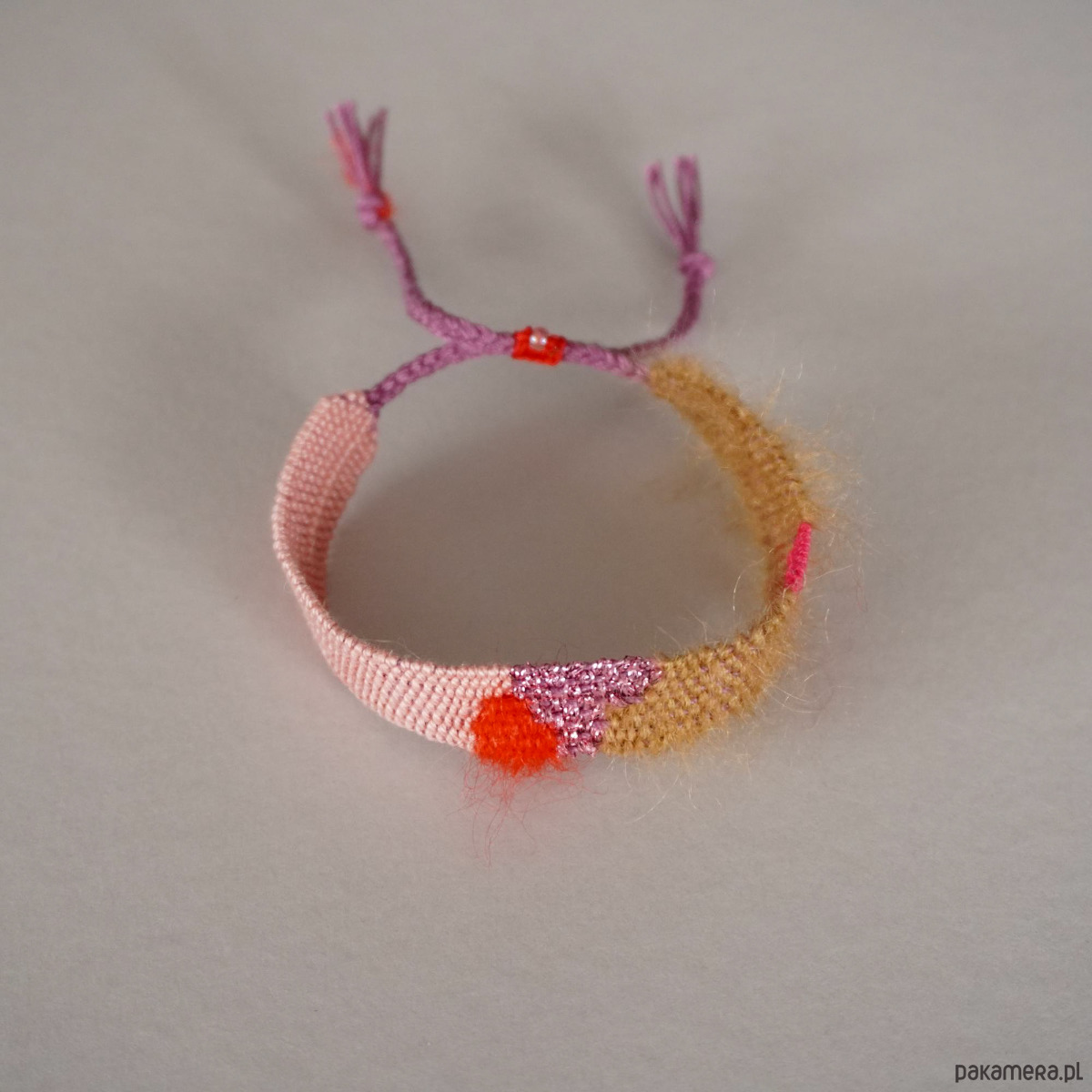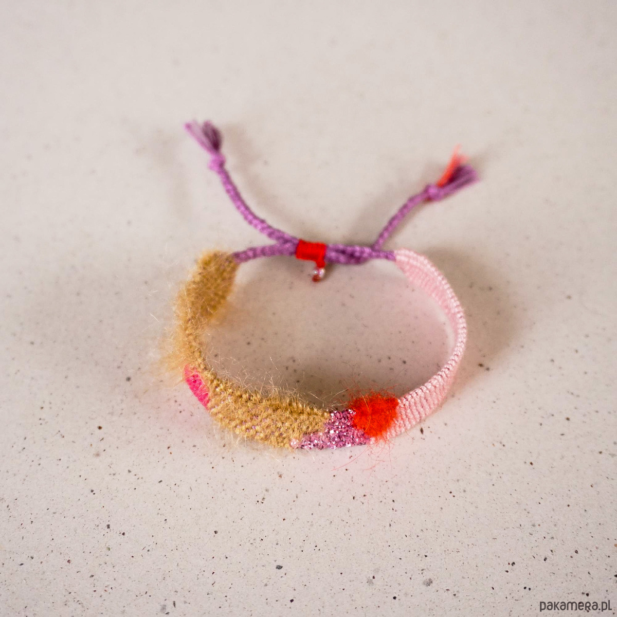 Tkana bransoletka na sznurku - róż, czerwień, karmel