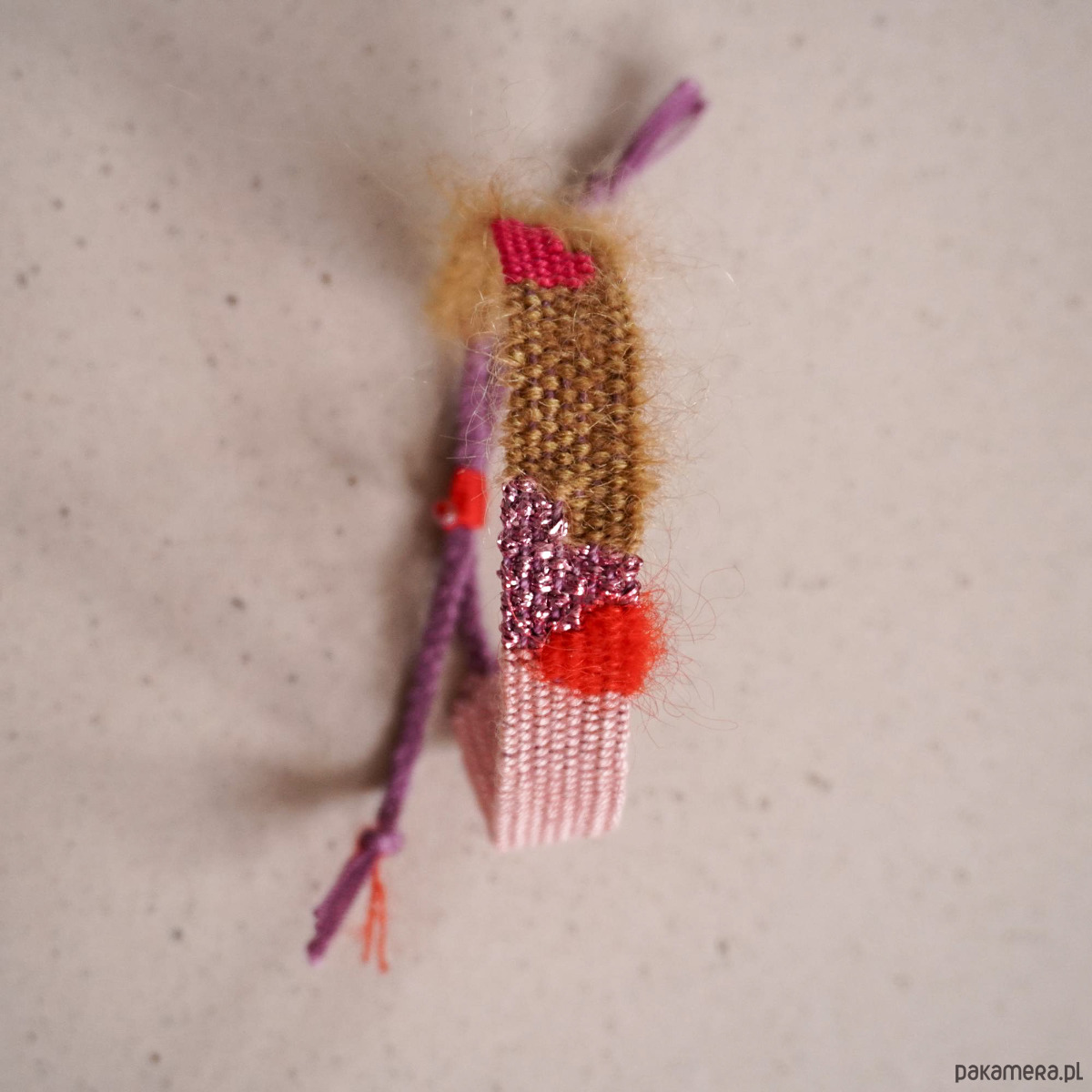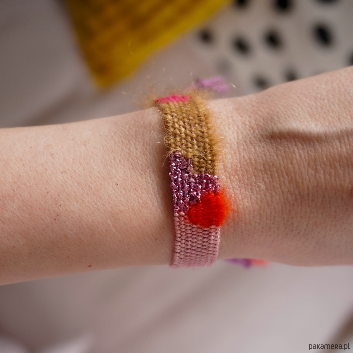 Prześliczna tkana ręcznie bransoletka w bajecznej kolorystyce, róż, karmel, makowa czerwień, błyszczący fiolet. Szerokość części tkanej to niecałe 1,5 cm, długość części tkanej to około 14, 15 cm. Ta bransoletka ma regulowane zapięcie makramowe. Należy jednak zachować dużą ostrożność, zdejmując i wkładając bransoletkę. Nie ciągniemy za część tkaną.