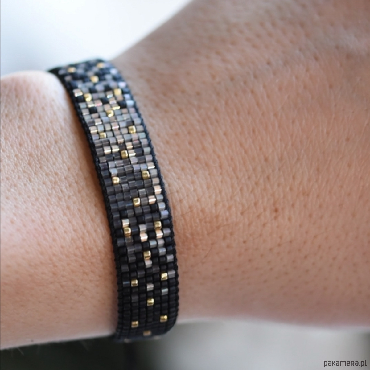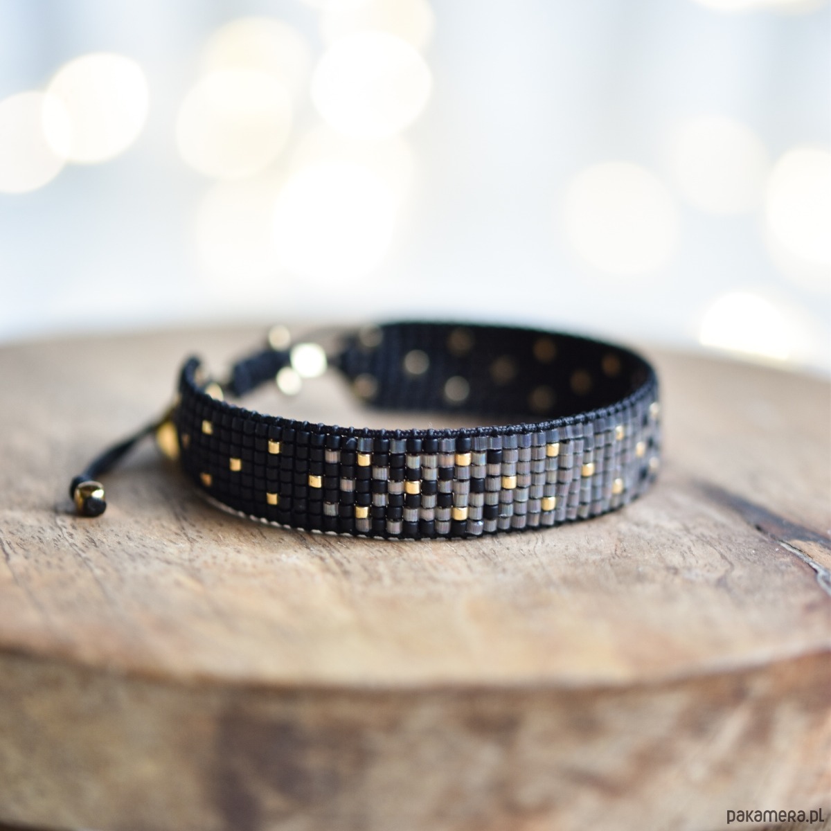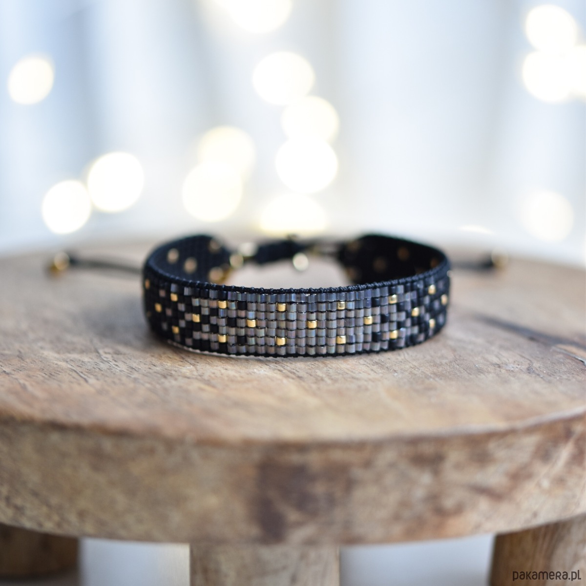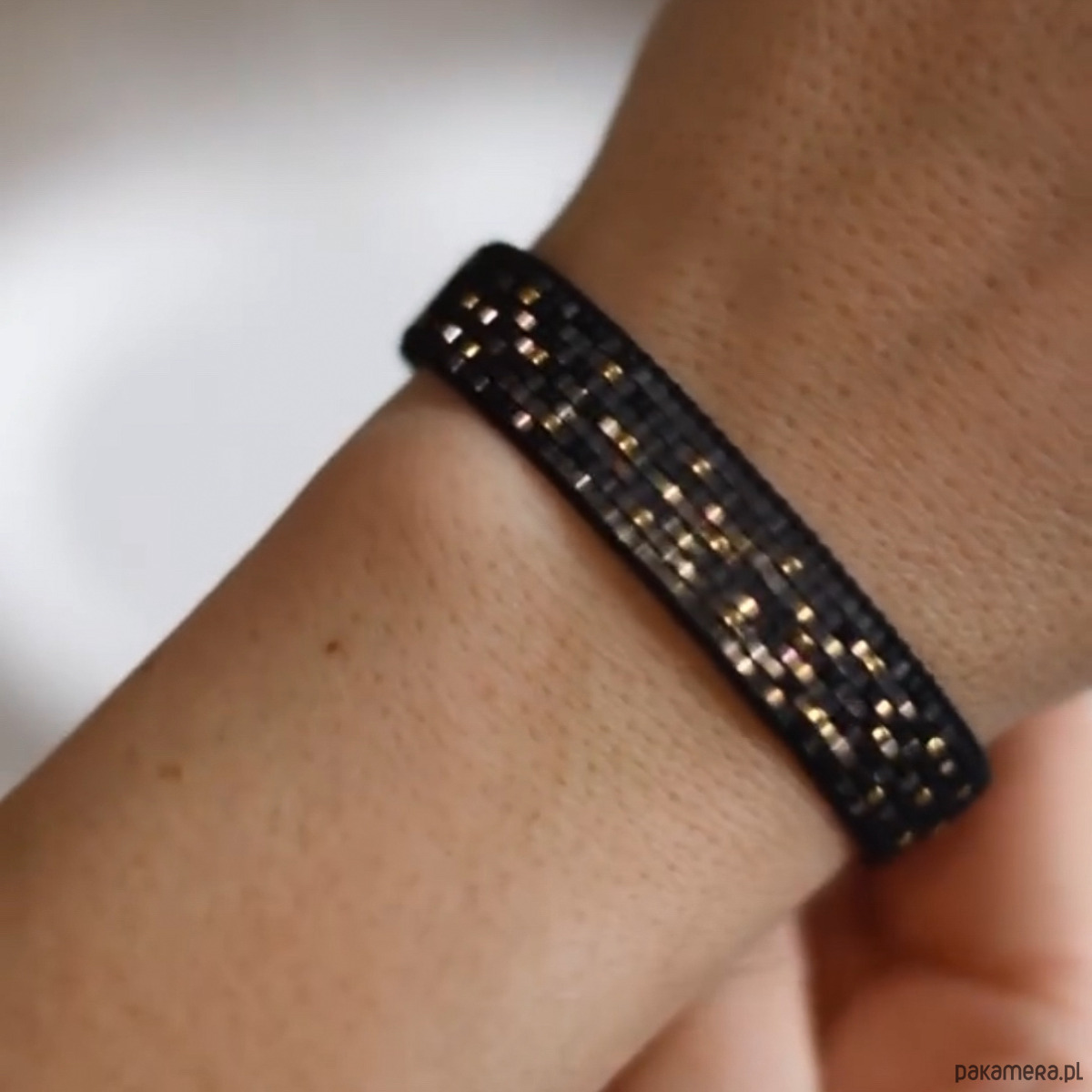 Czarna bransoletka tkana na krośnie z wyjątkowym złotym akcentem, to połączenie klasy i nowoczesnego blasku. Głęboka czerń stanowi idealne tło dla złotych oraz szarych detali, które intensywnie mienią się w świetle, przyciągając spojrzenia i dodając biżuterii elegancji. Starannie wykonana techniką tkania na krośnie zachwyca precyzją oraz trwałością. To doskonały dodatek zarówno do codziennych stylizacji, jak i na wyjątkowe okazje – subtelna, a jednocześnie wyrazista.