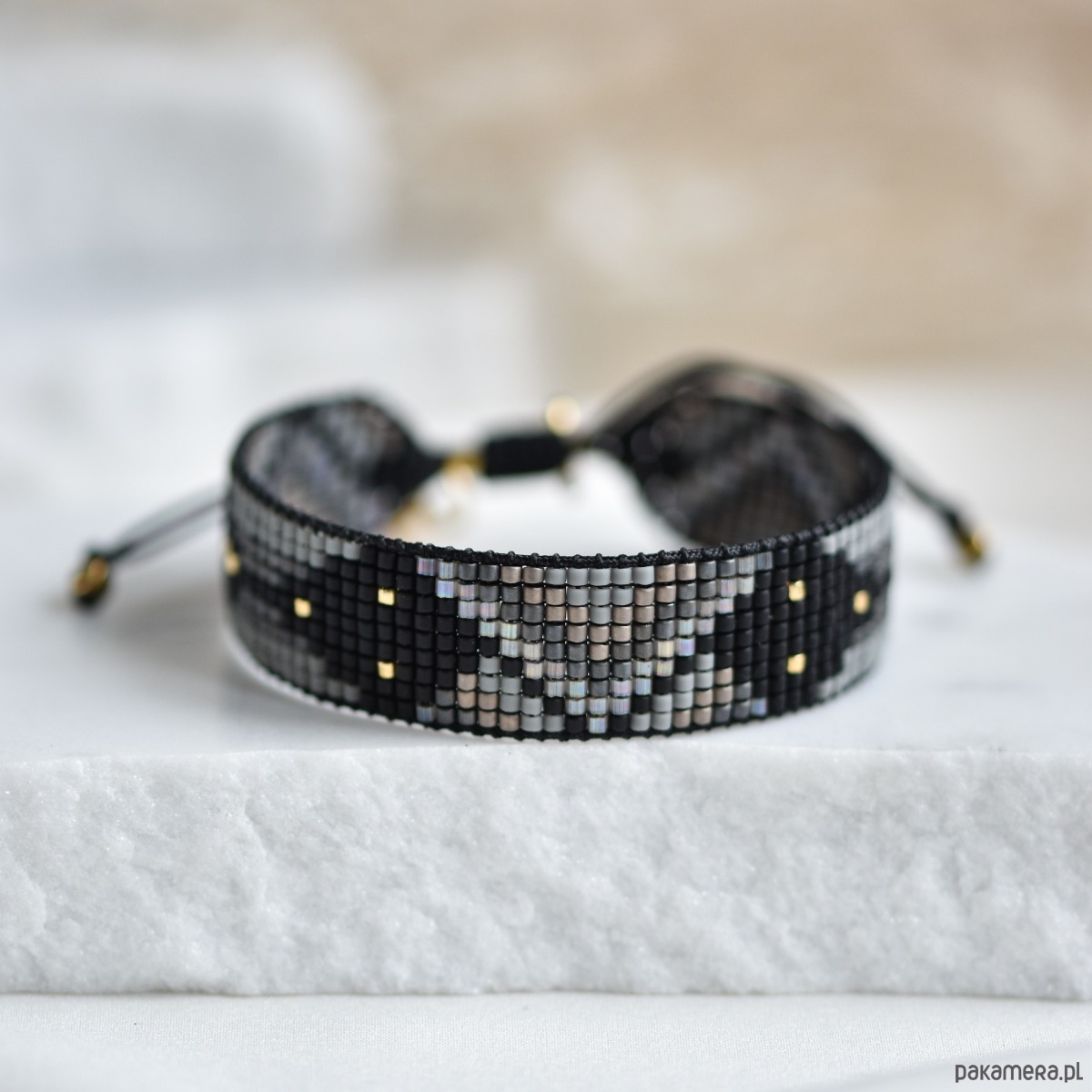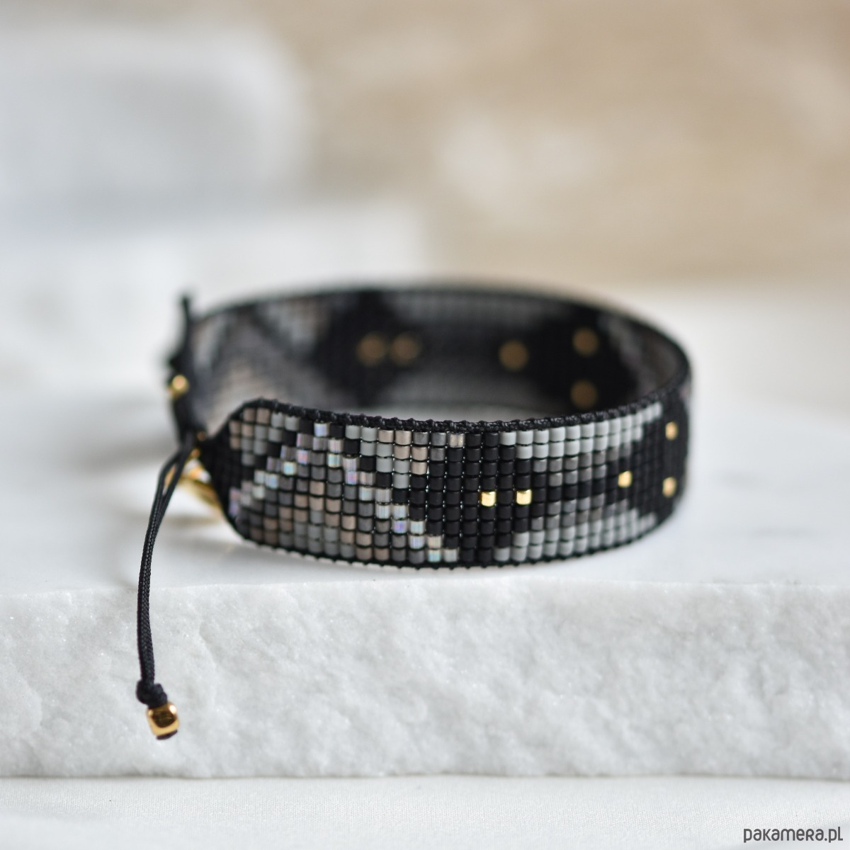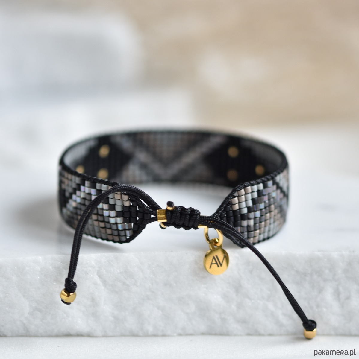 Tkana na krośnie bransoletka z cylindrycznych, wysokiej jakości koralików Miyuki z zawieszką ze stali szlachetnej z logo marki