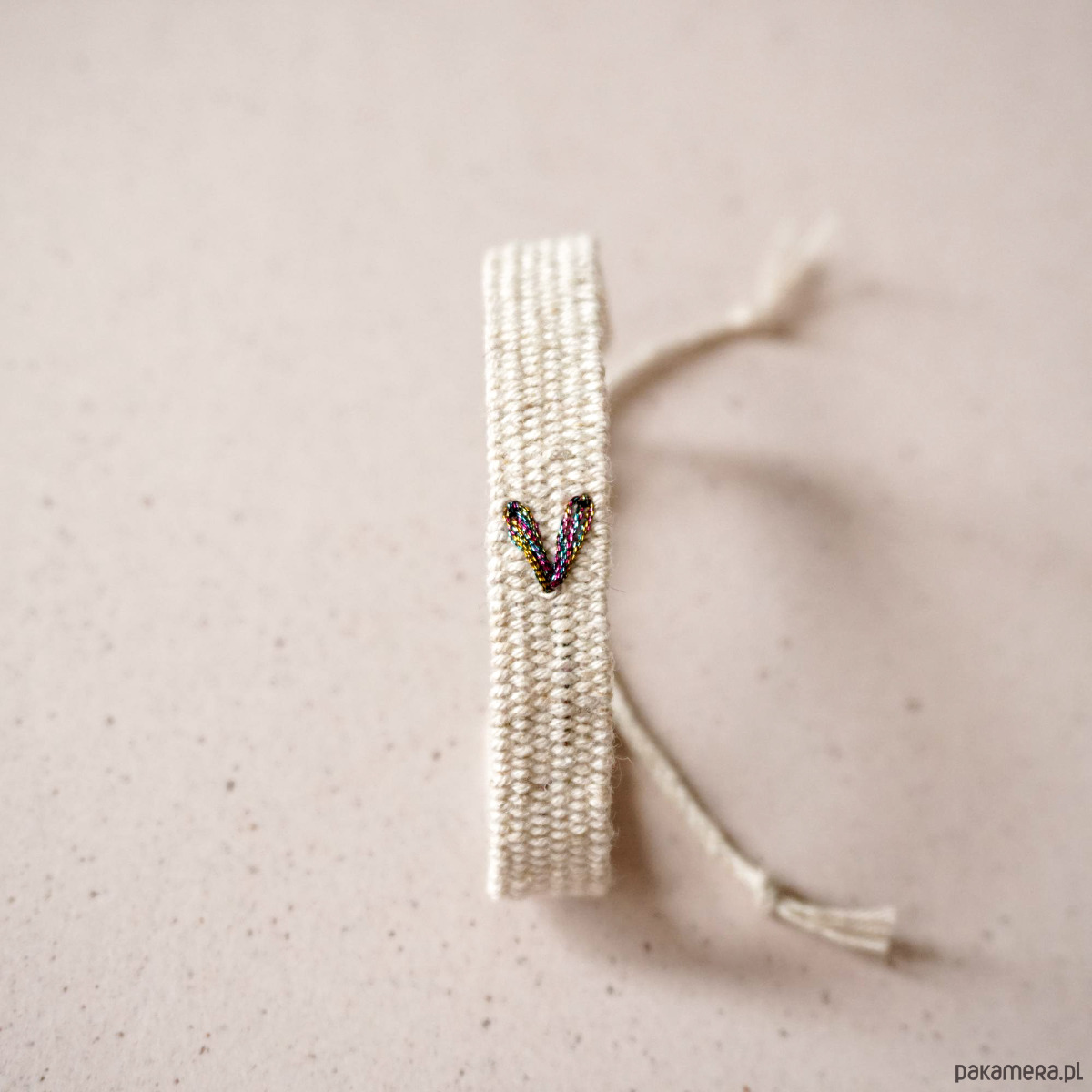 Tkana bransoletka z bawełny i lnu z haftowanym tęczowym serduszkiem