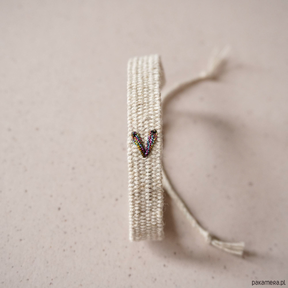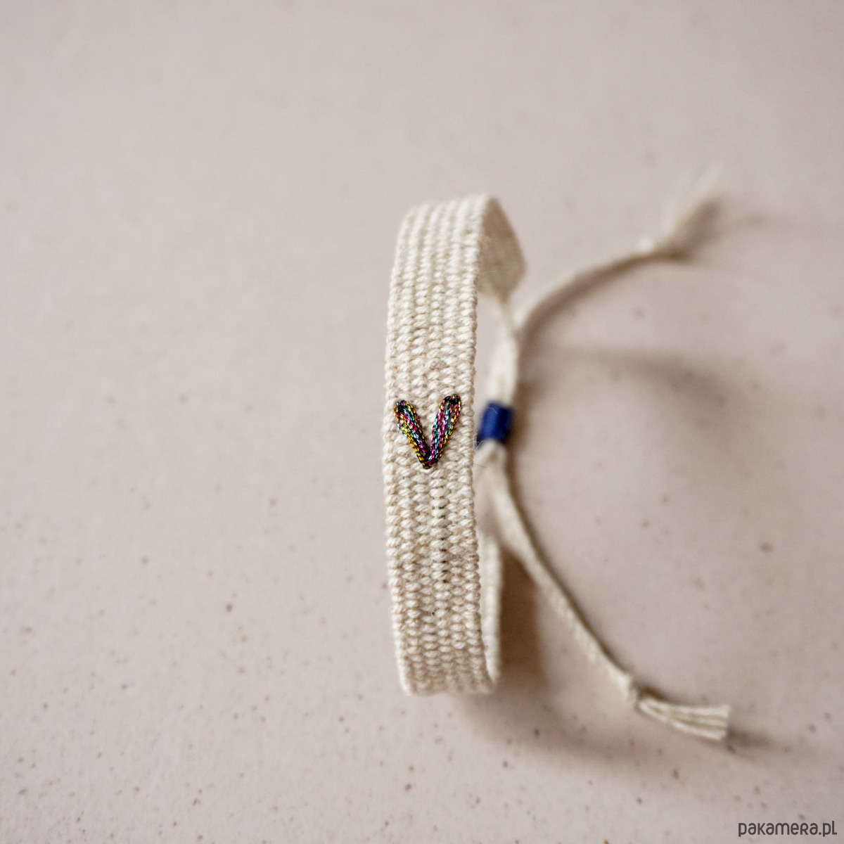 W tej ofercie w sprzedaży jest bransoletka tkana ręcznie z bawełny i lnu z haftowanym, błyszczącym serduszkiem. Połączenie surowości, matowej faktury z tęczowym błyskiem jest naprawdę piekne. Szerokość ok. 1 cm, długość części tkanej około 15 cm, dodatkowo sznureczki wiązane na supełek zapewniają regulację obwodu. Zapięcie jest wykonane z nici techniką makramy. Bransoletka jest nie tylko piękna ale również niezwykle wygodna w noszeniu . Polecam serdecznie.
