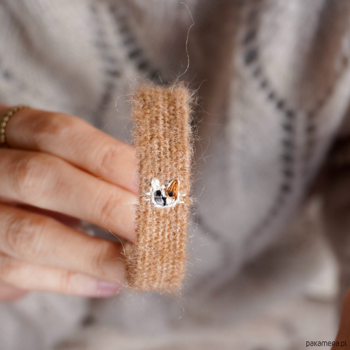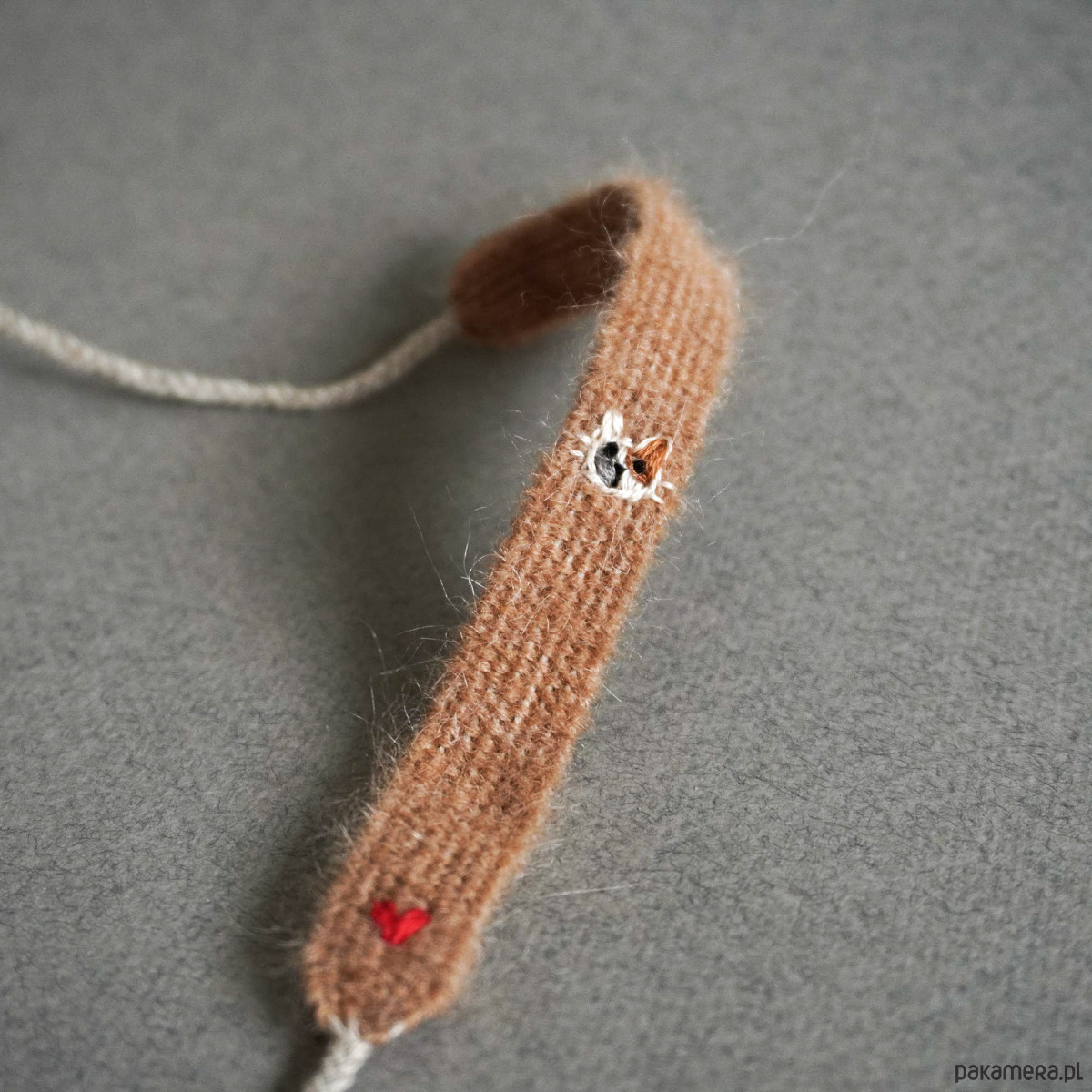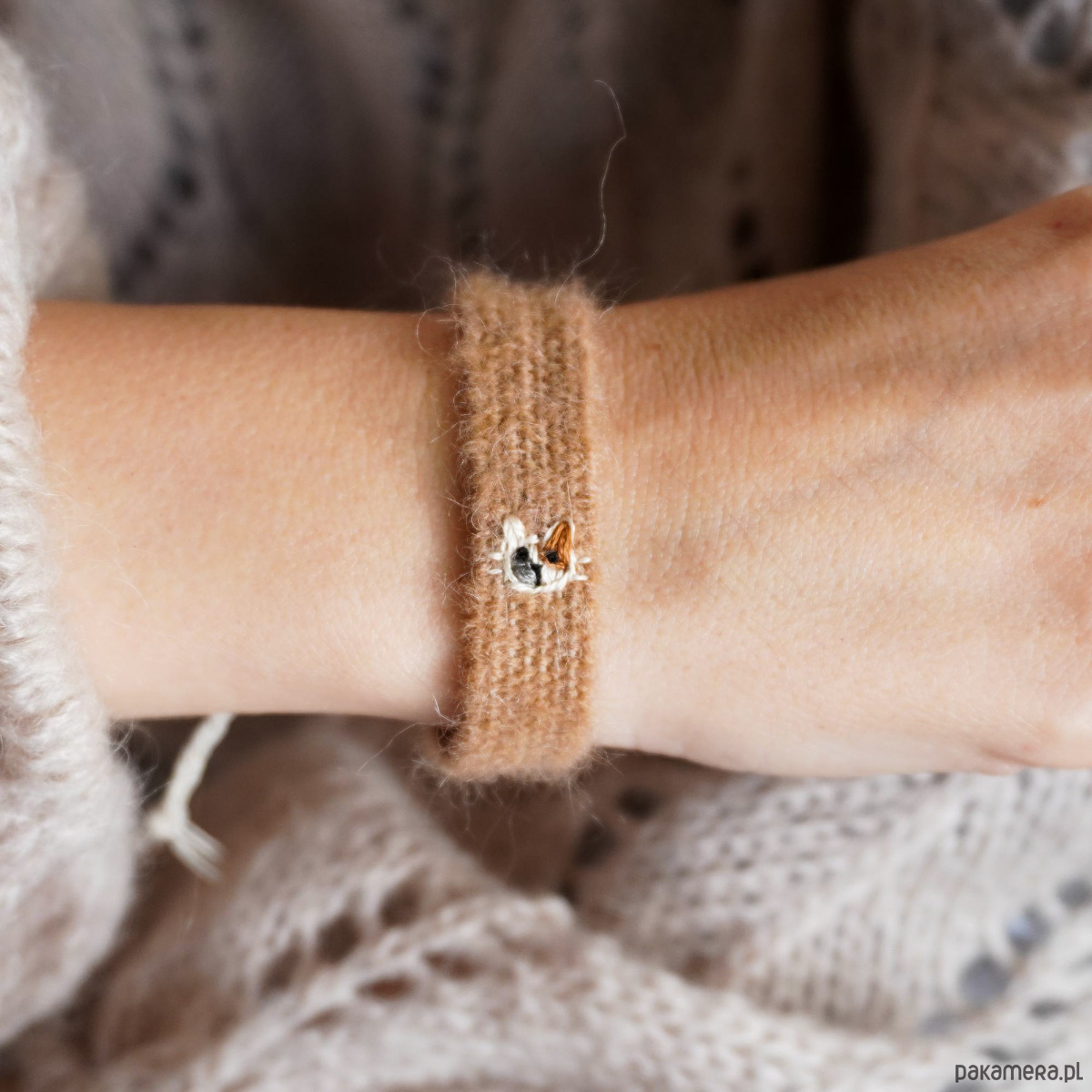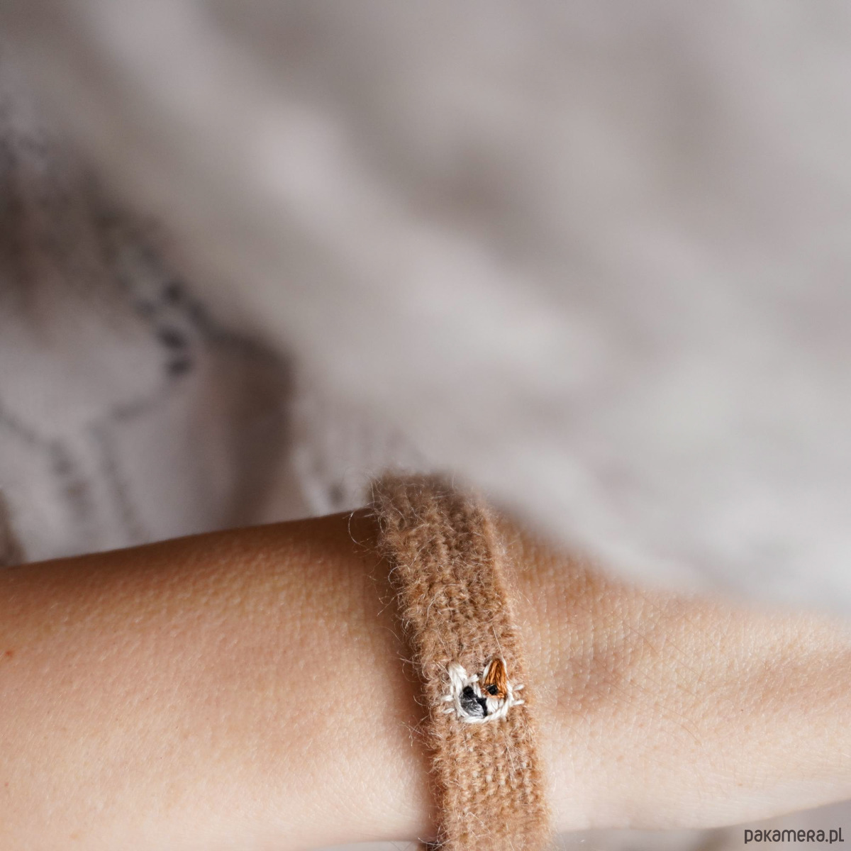 Tkana bransoletka z haftowanym kotkiem, wiązana na supełek